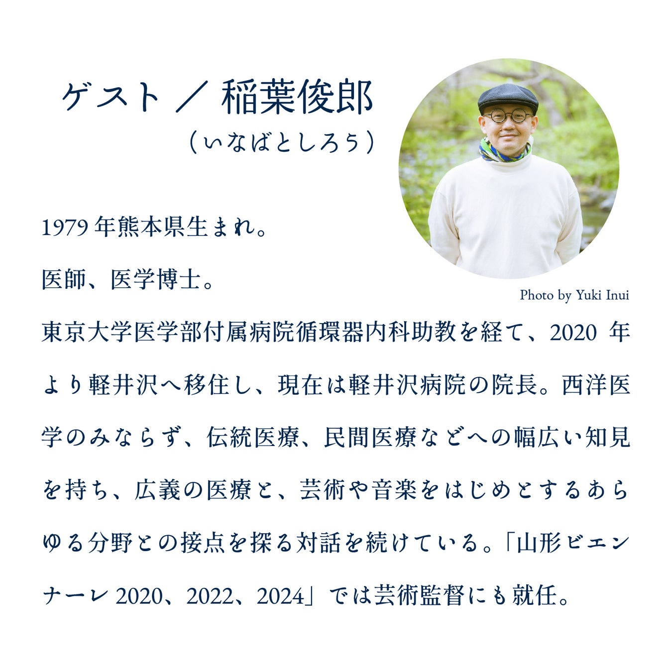 稲葉先生は、熊本出身で東大医学部へ進み循環器内科の医療に取り組む中で西洋医学の限界を感じつつ軽井沢に移住。現在は、⻄洋医学はもちろん、伝統医療や哲学・思想、芸術などへの幅広い知見を携え、軽井沢を拠点にケアやアートを切り口にした「すこやかな地域づくり」に取り組んでおられます。これまでに医学博士の養老孟司氏や能楽師の野村萬斎氏、音楽家の大友良英氏らとの対談もされて来られました。4冊の単著を上梓され、多数の共著や雑誌への寄稿、様々なメディアを通じての発信により、医療という分野の枠を超えて、他分野の人々へも影響を与えてきました。