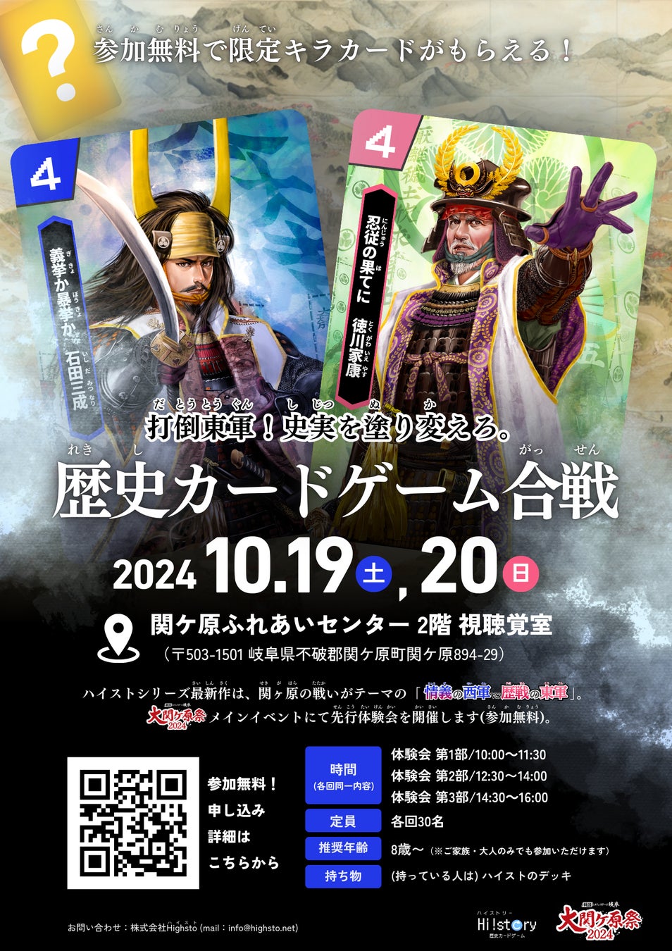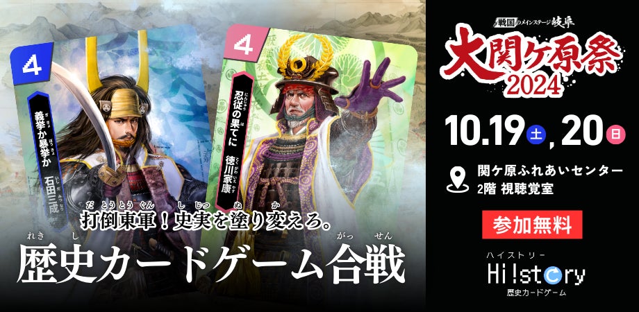 岐阜県・関ケ原町主催の「大関ケ原祭2024」に株式会社Highstoが出展。10/19,20のメインイベントにて、歴史カードゲーム「Hi!story(ハイストリー)」関ヶ原デッキの先行体験会を開催。