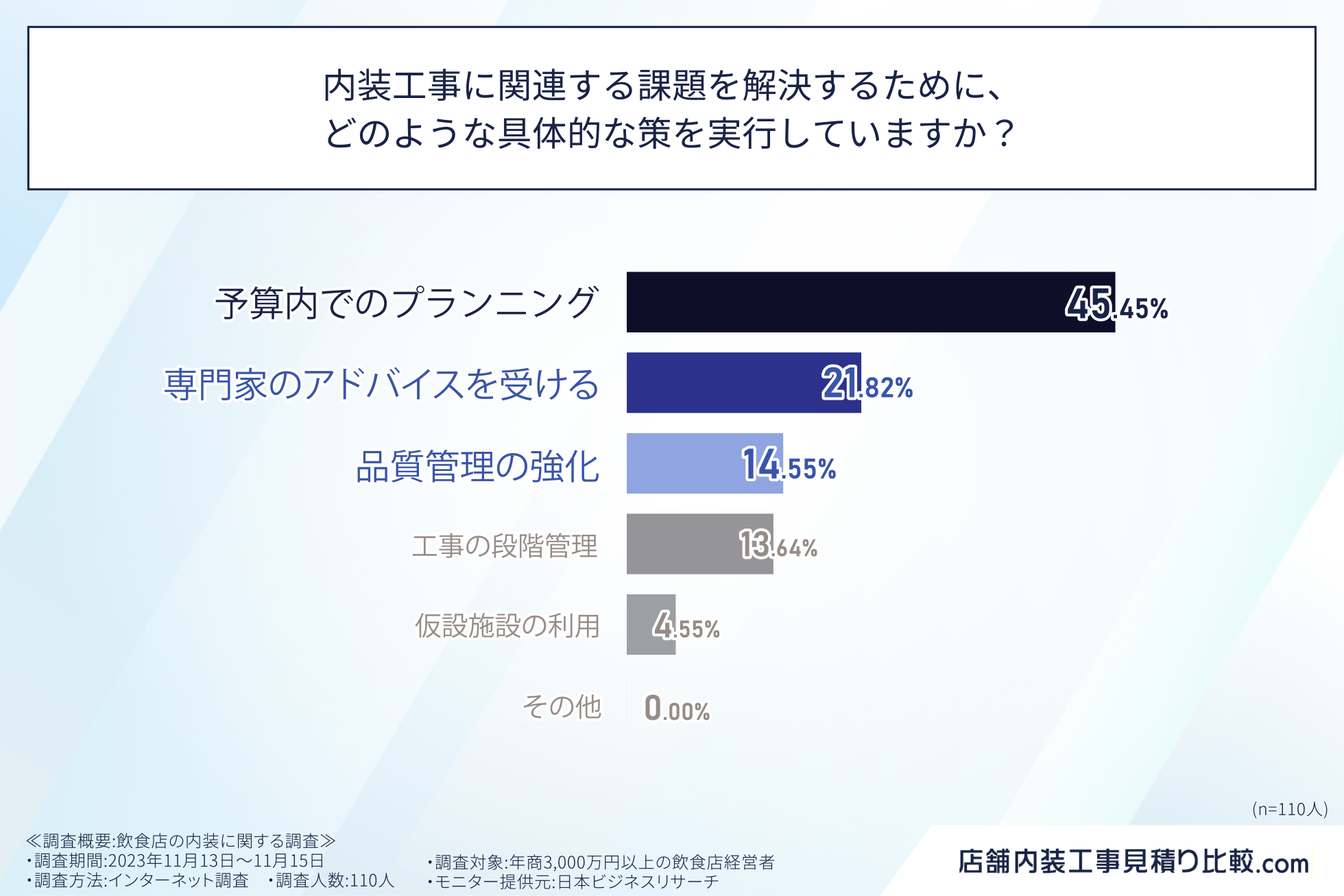 内装工事の際、「予算内でのプランニング」をしている、と答えた飲食店経営者が45.45%と半数近くの回答を占めていました。