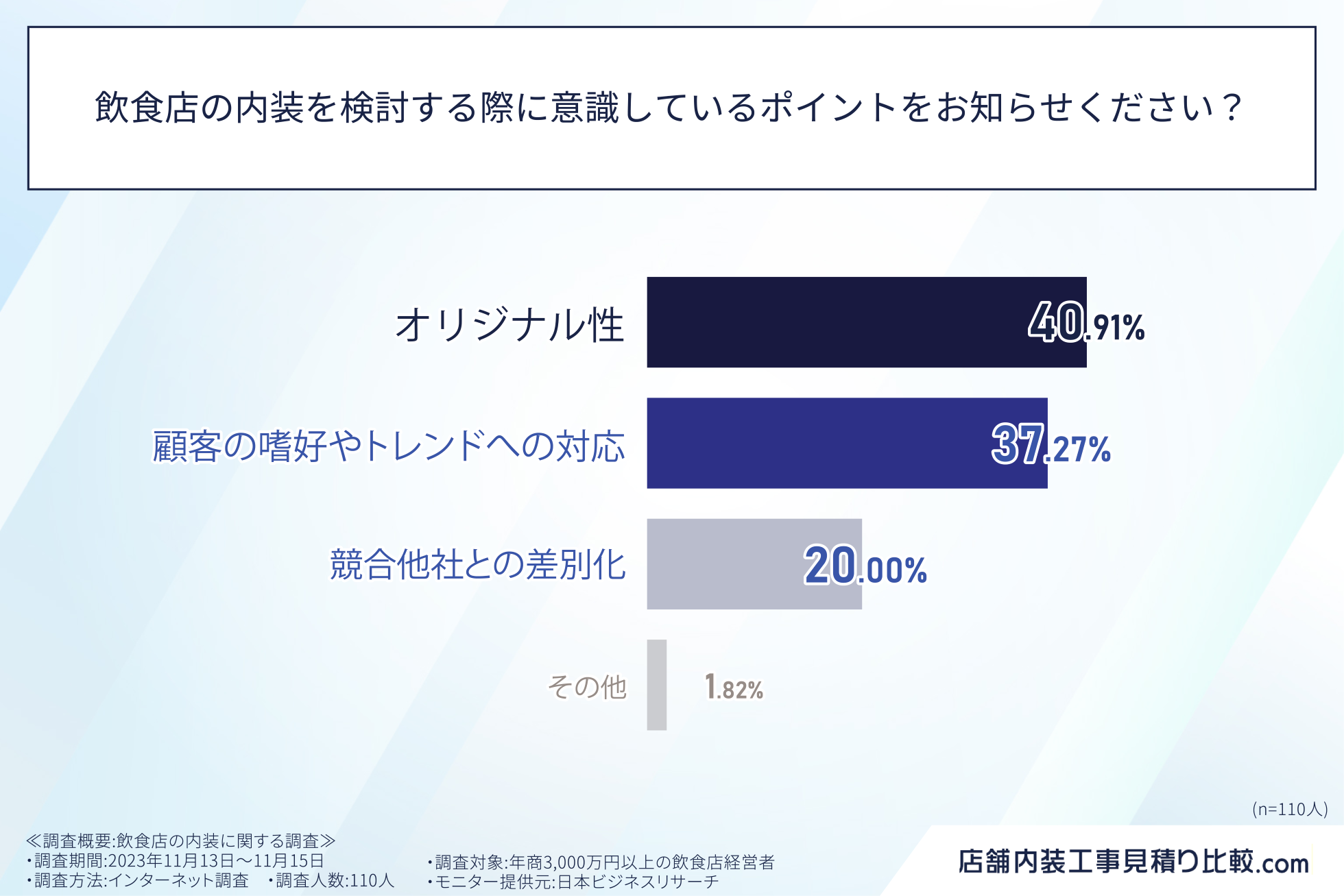 内装を検討する際に、どのような部分を意識しているのか、というアンケートでは、「顧客の嗜好やトレンドへの対応」が37.27%、「競合他社との差別化」が20.00%、「オリジナル性」が40.91%、その他が1.82%という結果になりました。