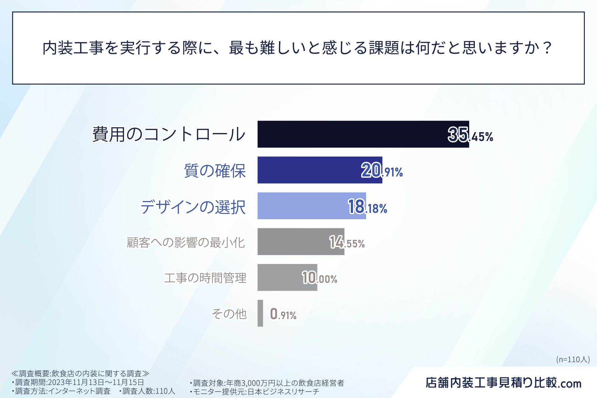 飲食店経営者がもっとも課題だと感じているのは、35.45%が挙げた「費用のコントロール」です。内装をこだわればこだわるほど、費用が高額になるケースもあり、予算内でどこまでできるか、という部分も課題になりそうです。