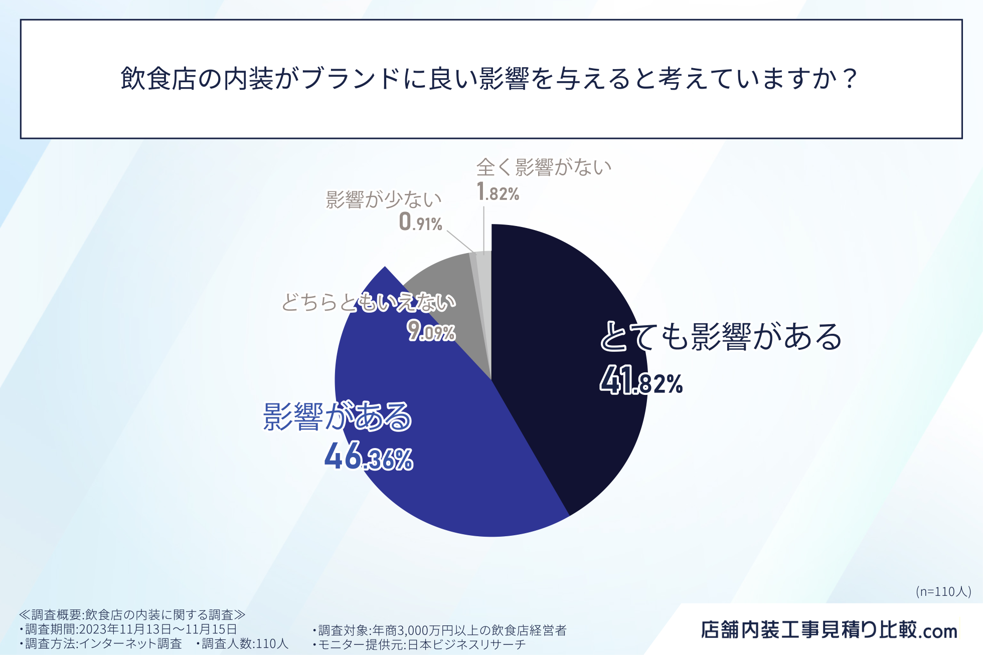 本アンケートを通じて、売上3,000万円以上の飲食店経営者のほとんどが、「内装によって売上やブランド力に影響が出る」と考えていると分かりました。