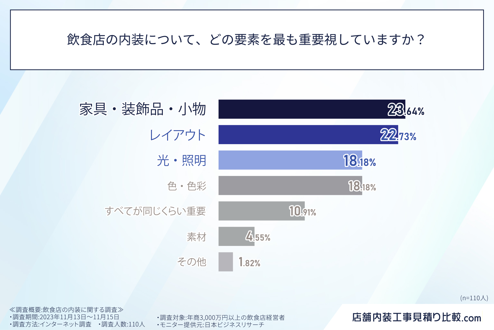 もっとも多かった答えが「レイアウト」で22.73%、次が「家具・装飾品・小物」で23.64%という結果になりました。その他にも、「光・照明」「色・色彩」がともに18.18%、次いで「すべてが同じくらい重要」「素材」「その他」という回答になっています。