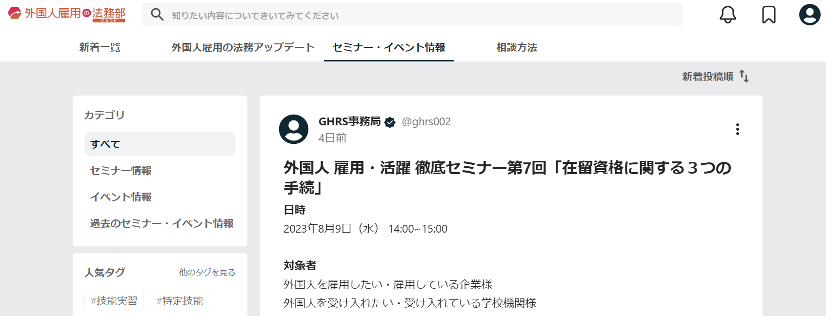 当ポータルサイトでは、外国人雇用に関連するセミナーやイベントの情報も提供しています。毎月様々な機関からセミナーやイベントに当法人専門家をお呼びいただいており、それらの情報を随時掲載・更新しています。これにより、外国人雇用に関心のある方々が重要なトピックや専門知識を得る機会を提供しています。