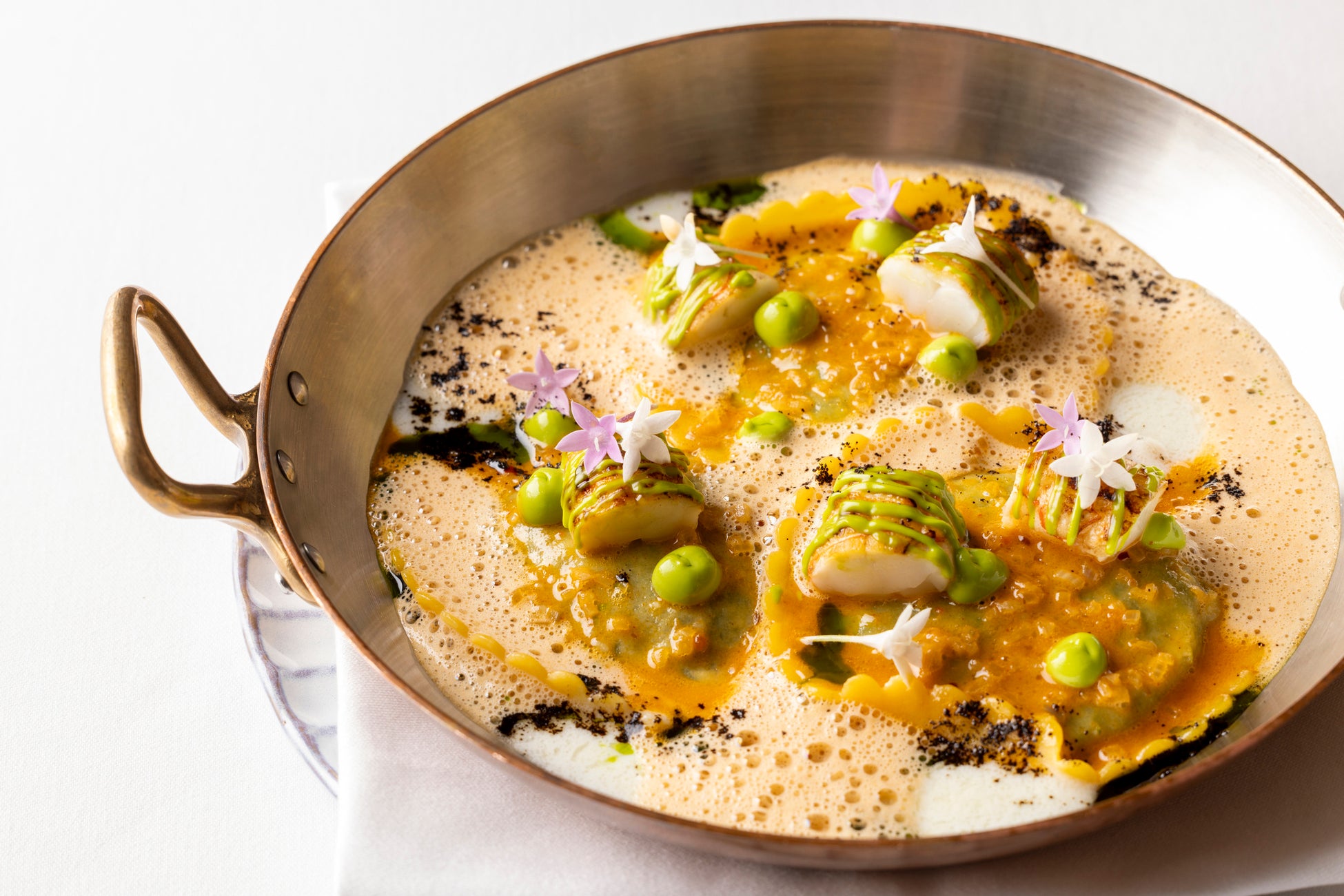・ラビオリ ほうれん草 手長海老 ンドゥイヤ リコッタチーズ コーヒー 海苔のムースリーヌ