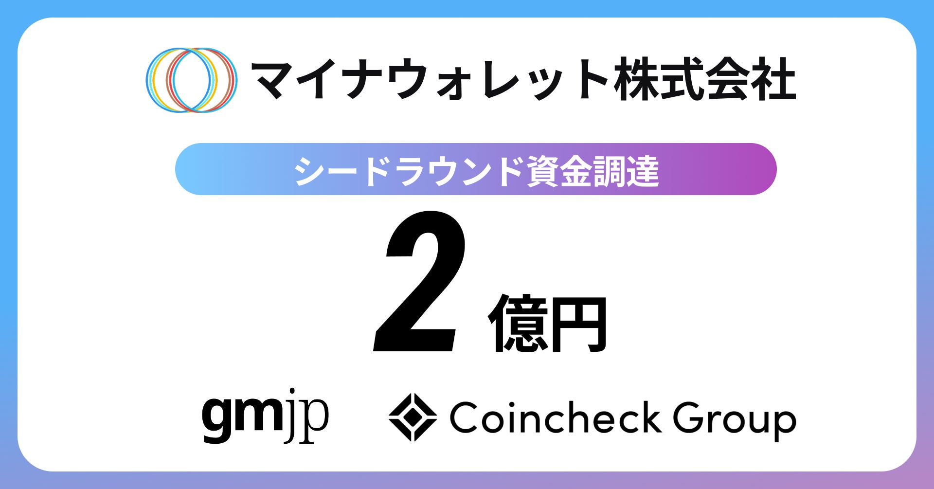 マイナウォレット株式会社(本社:東京都千代田区、代表取締役:橘博之、以下当社)は、シードラウンドで gmjp holdings、及び Coincheck Group N.V. を引受先とした第三者割当増資により、2億円の資金調達を実施したことをお知らせいたします。