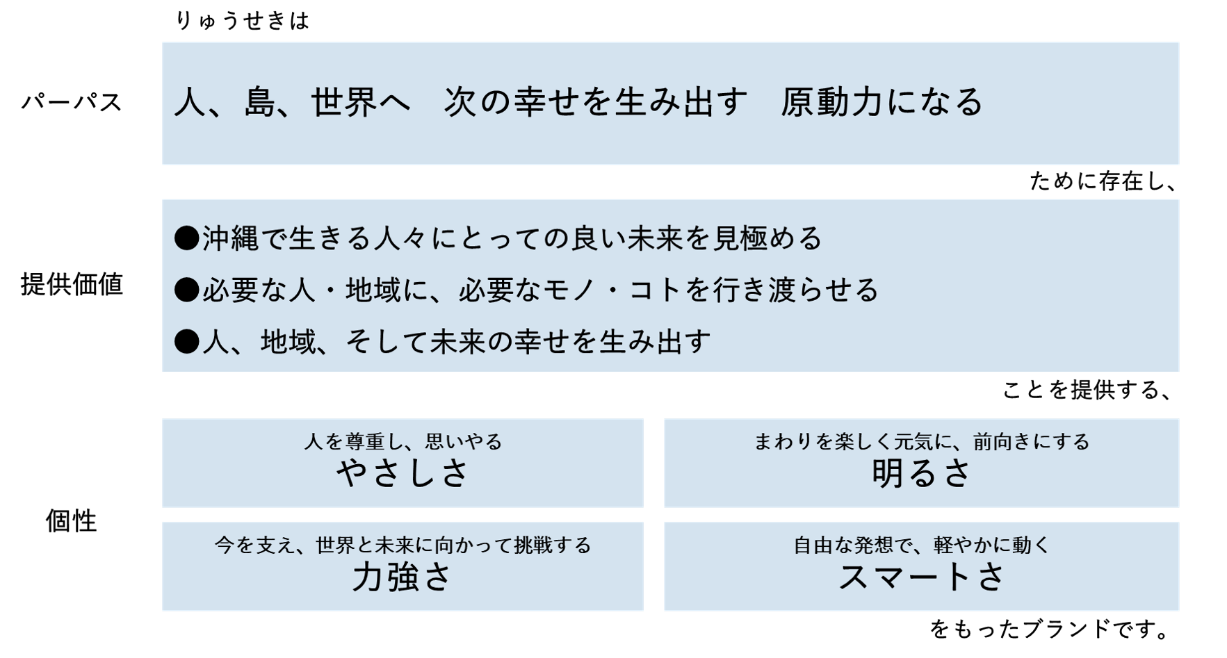 これからの時代を進むブランドコンセプトとして、事業の最終目的と存在意義を示した「パーパス」、県民、地域、取引先、社員といった社内外の皆様に提供を約束する「提供価値」、それらの実現に向け備えるべき「個性」を制定しました。ブランドコンセプトの根底にあるのは、人、島、世界に次の幸せを生み出す力であり続けることが当グループの誇りであり、存在意義であるという強い信念です。