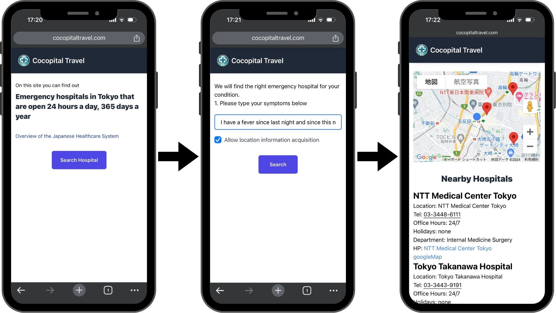 あなたの症状に適した近隣の救急病院を24時間即探せる!『cocopital Travel』―訪日外国人のための24時間救急外来検索サービスが新登場―(日本人向けもあり)