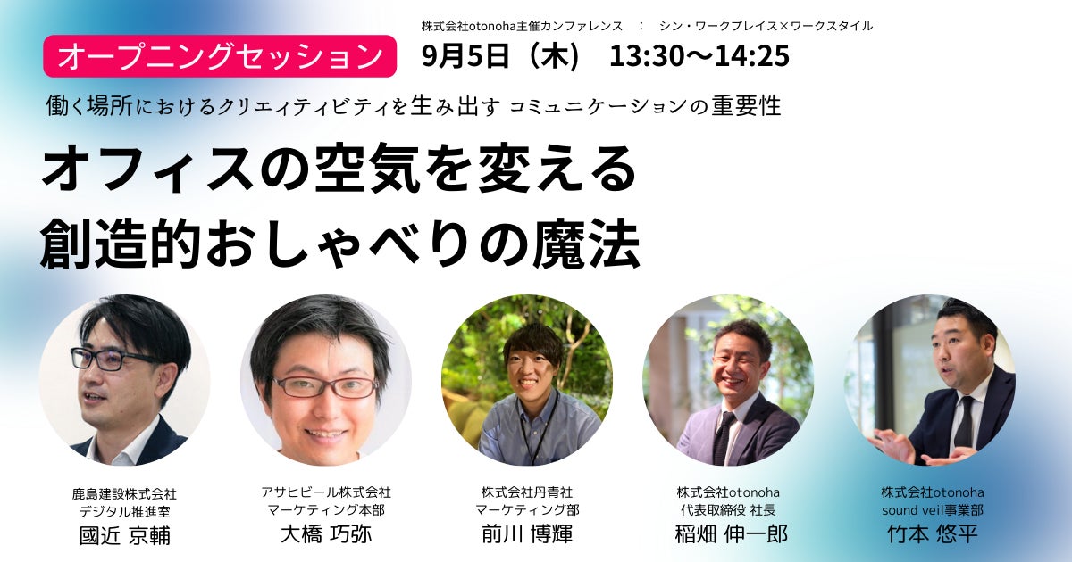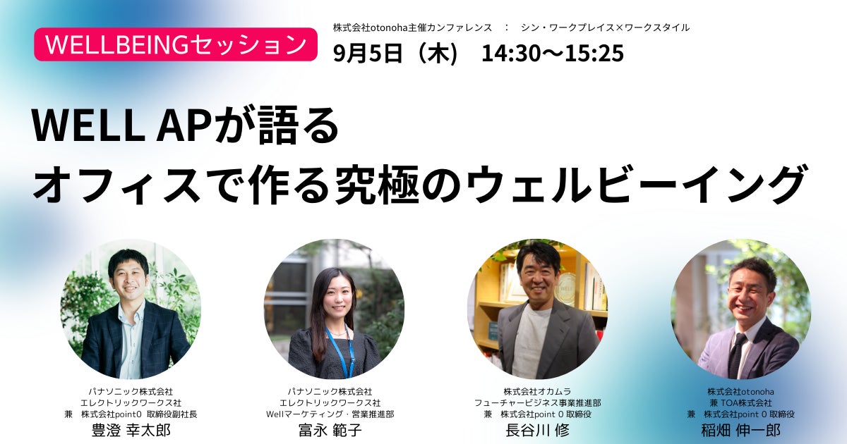 株式会社otonoha(本社:東京都千代田区、代表取締役社長:稲畑伸一郎、以下「otonoha」)は、設立後初となるカンファレンス「ワークプレイスの未来を考える1Day ~今、気になるが、きっとわかる シン・ワークプレイス×ワークスタイル~」を、2024年9月5日(木)に開催いたします。