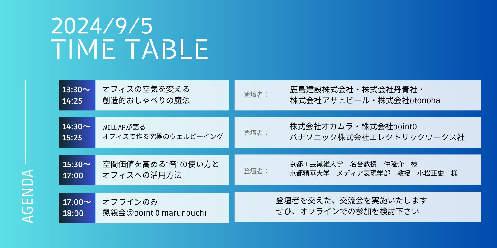 株式会社オカムラ、鹿島建設株式会社、株式会社スマドリ(アサヒグループ)、株式会社丹青社、パナソニック株式会社、株式会社point0