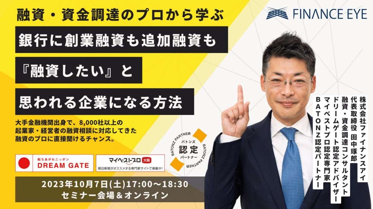 10/7開催『起業時の創業融資も追加融資も銀行に“融資したい!”と思われる会社になる方法』起業家・経営者の資金調達のリアルを成功事例を交えてファイナンスアイが紹介