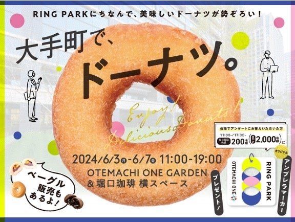 同僚や友人とゆったり過ごすフードアイテムとして、RING PARKにちなんで、美味しいドーナツを集めたイベント「大手町で、ドーナツ。」を開催いたします。OTEMACHI ONE GARDENでドーナツを片手に、芝生に腰を下ろして休憩したり、談話したり、リラックスした時間を生み出します。