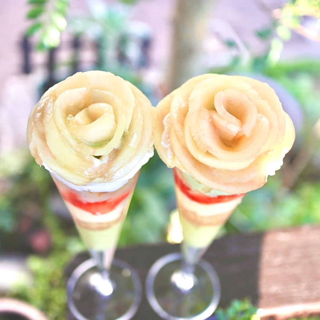 最上部は薄切りの桃で組み立てられた薔薇が美しく、運ばれてきた瞬間から笑顔になれるビジュアルが最高なパフェです。