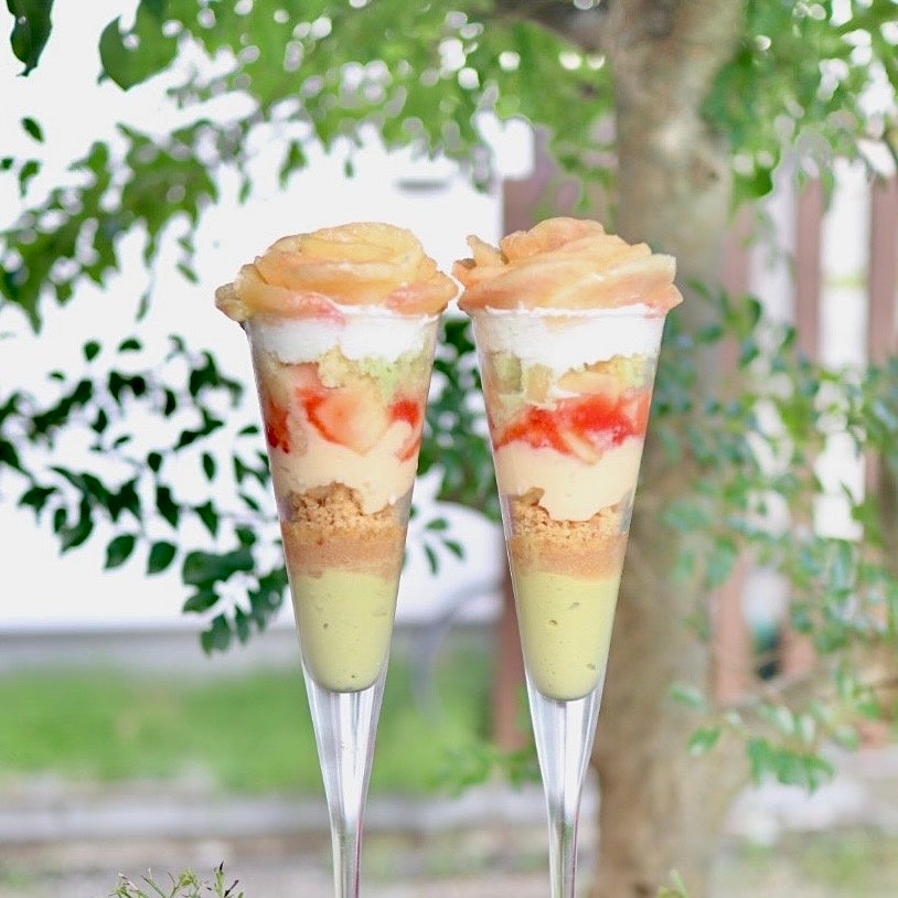 スタイリッシュなグラスにピスタチオムースやカスタードクリームなど10層が織りなす味のハーモニー