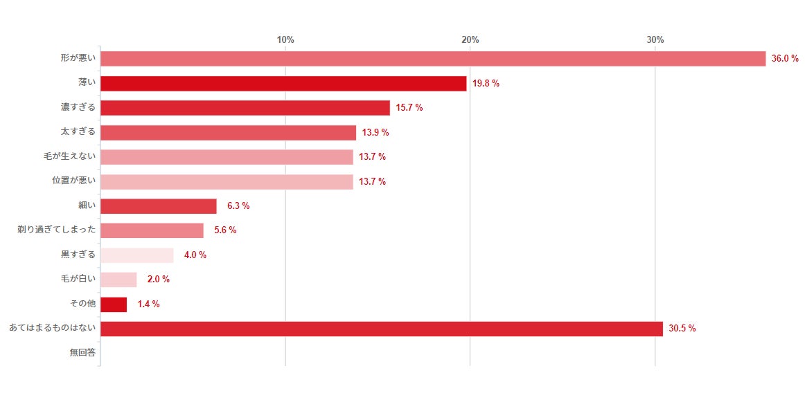 「まゆ毛の悩みはありますか」とのについては、「形が悪い」36.0%、「薄い」19.8%、「毛が生えない」13.7%との回答があり、発毛状態に起因する悩みをお持ちの方がいらっしゃると考えられます。
