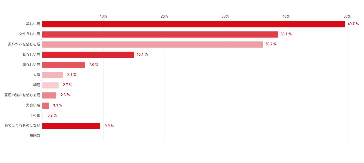 「どのような眉を望みますか」との設問では、「美しい眉」49.7%、「女性らしい眉」38.7%、「柔らかさを感じる眉」36.2%に対して、「太眉」3.4%、「細眉」2.7%との回答がありました。多様化の時代の中で、一般的に言われる“まゆ毛の流行”にとらわれず、自分らしさの表現を志向していることが推測できました。