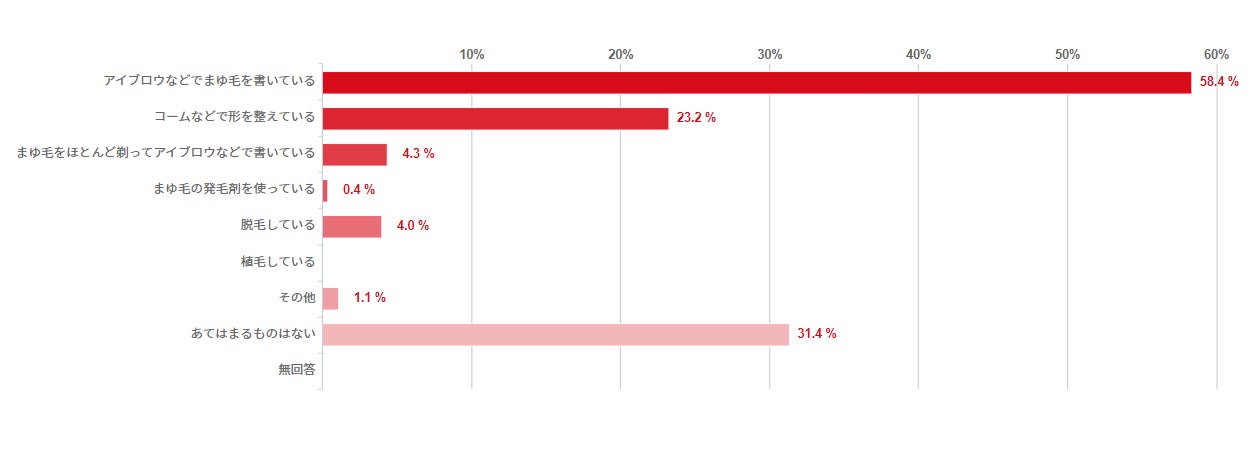 「あなたは、まゆ毛のケアをしていますか」との設問に対しては、「アイブロウなどでまゆ毛を書いている」58.4%、「コームなどで形を整えている」23.2%に対して、「まゆ毛の発毛剤を使っている」は0.4%と回答が得られました。多くの方が、現状の発毛状態への剃る、書くなどの対処を行うだけで、発毛剤等による発毛自体の改善を行っている方は少ないという結果になりました。