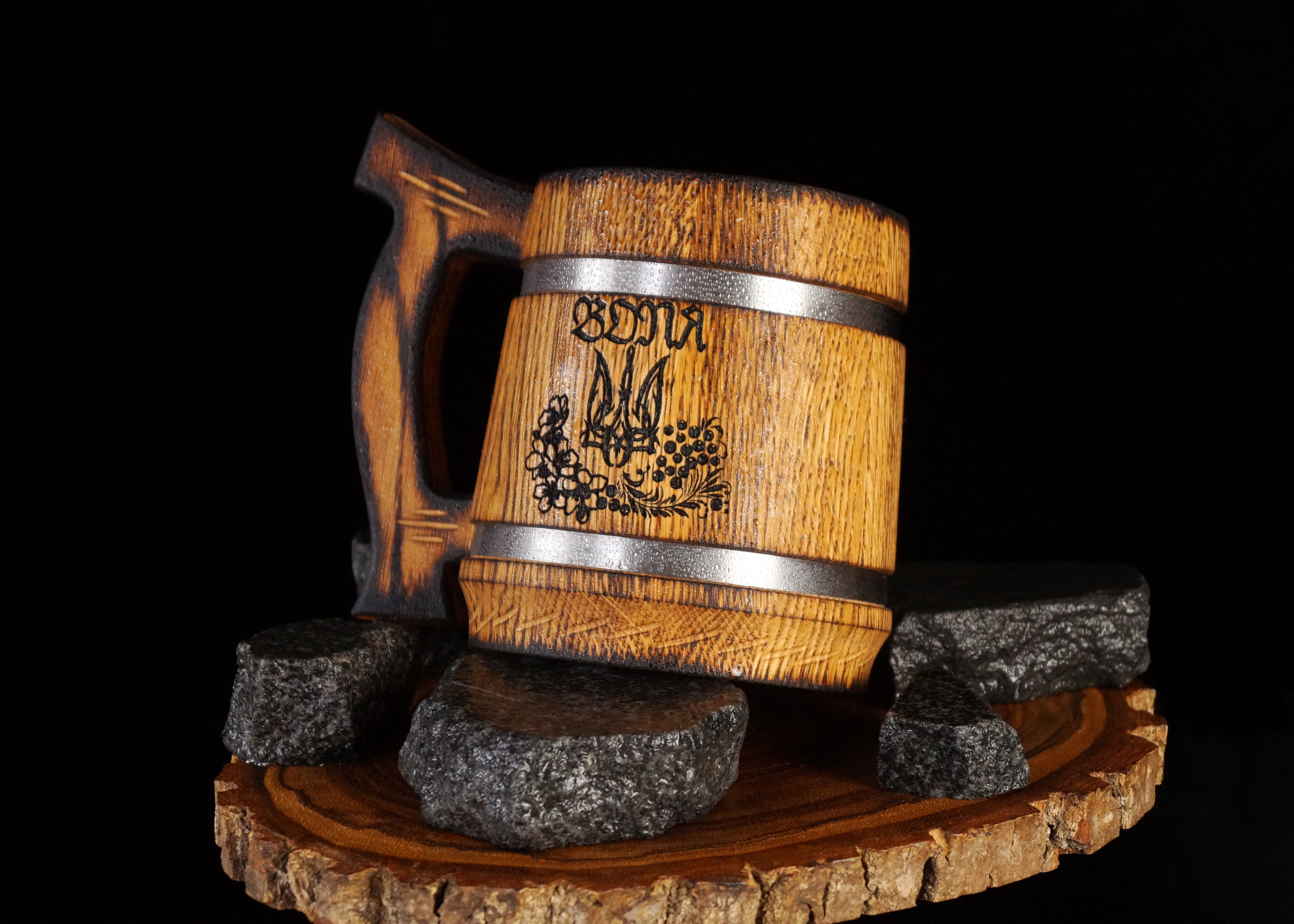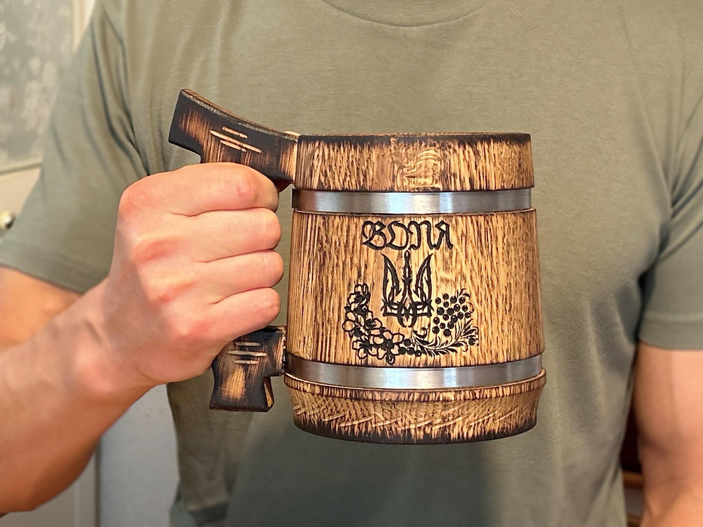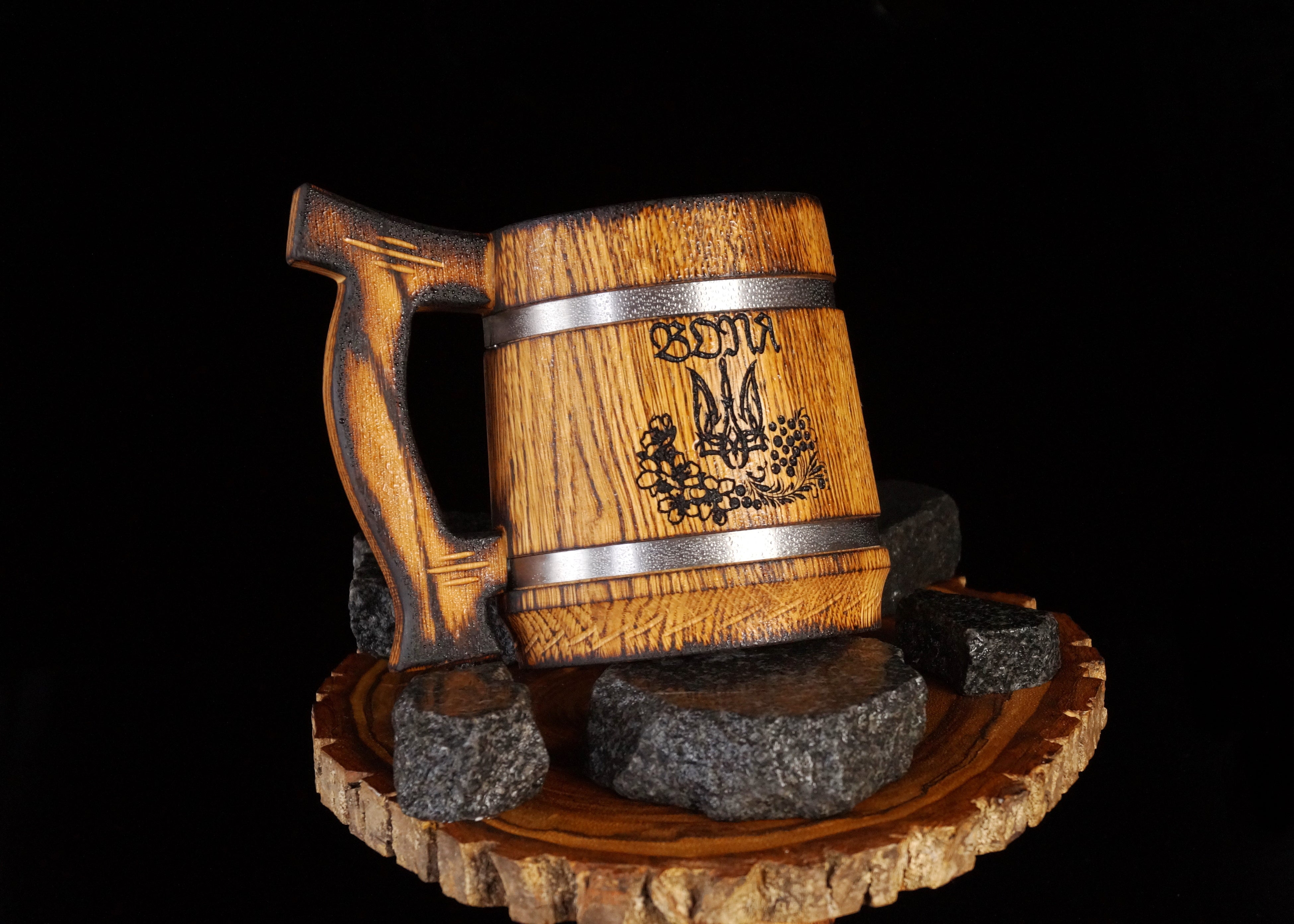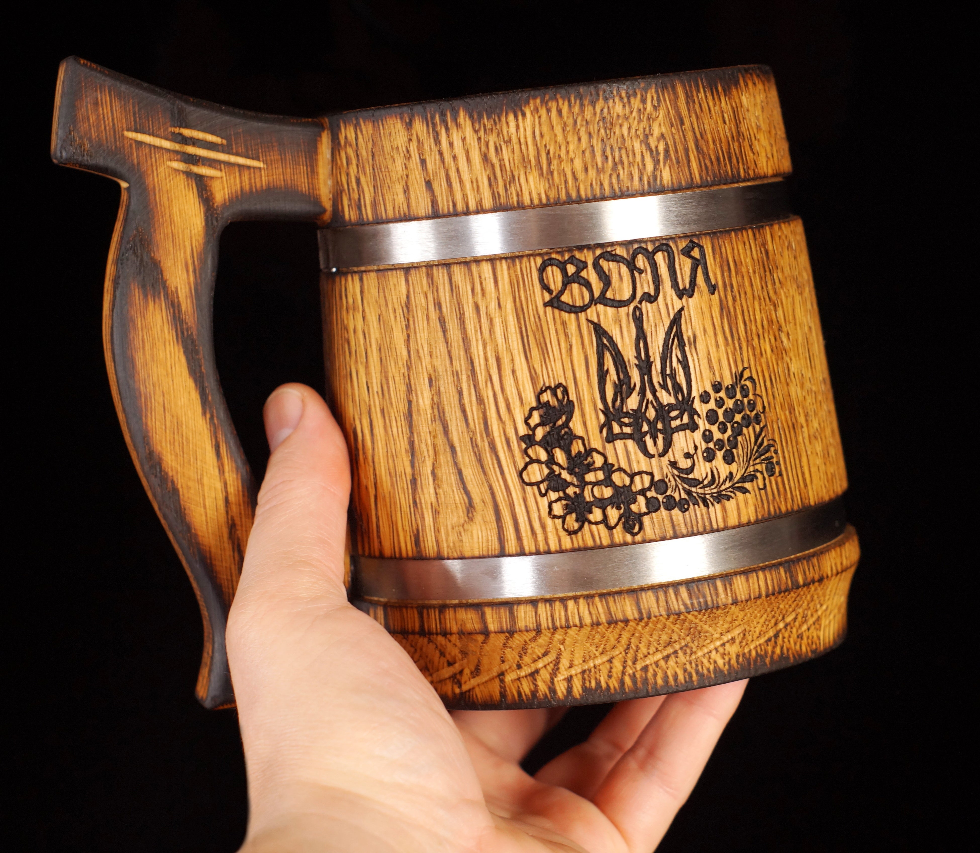 マグは、耐久性に優れたオーク材(ウクライナ産)を樽のように組み立てて作ります。ハンドルの絶妙なカーブが手にしっくりきて持ちやすく、職人技を感じます。木を握る感覚が気持ちよく、いつまでも触っていたくなります。木材の模様は二つとして同じものはなく、あなただけの世界にひとつのマグです。
