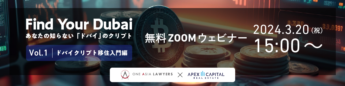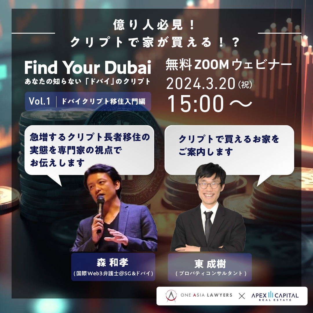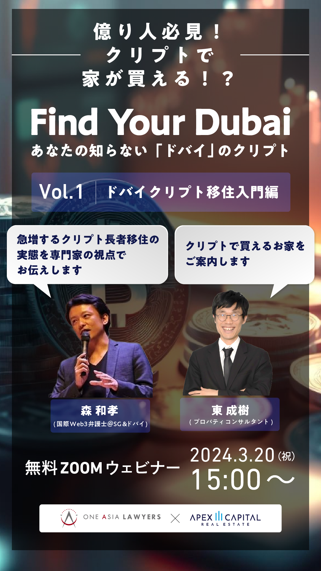 Web3.0弁護士の森 和孝氏と、ドバイ不動産のエキスパート集団 Apex Capitalが共催ウェビナー『ドバイ クリプト移住入門編』を3月20日(水)開催