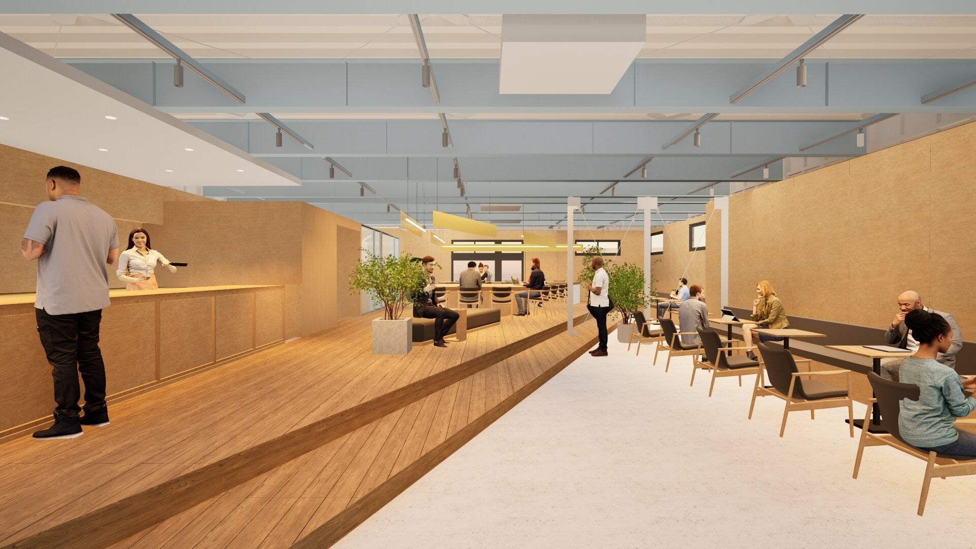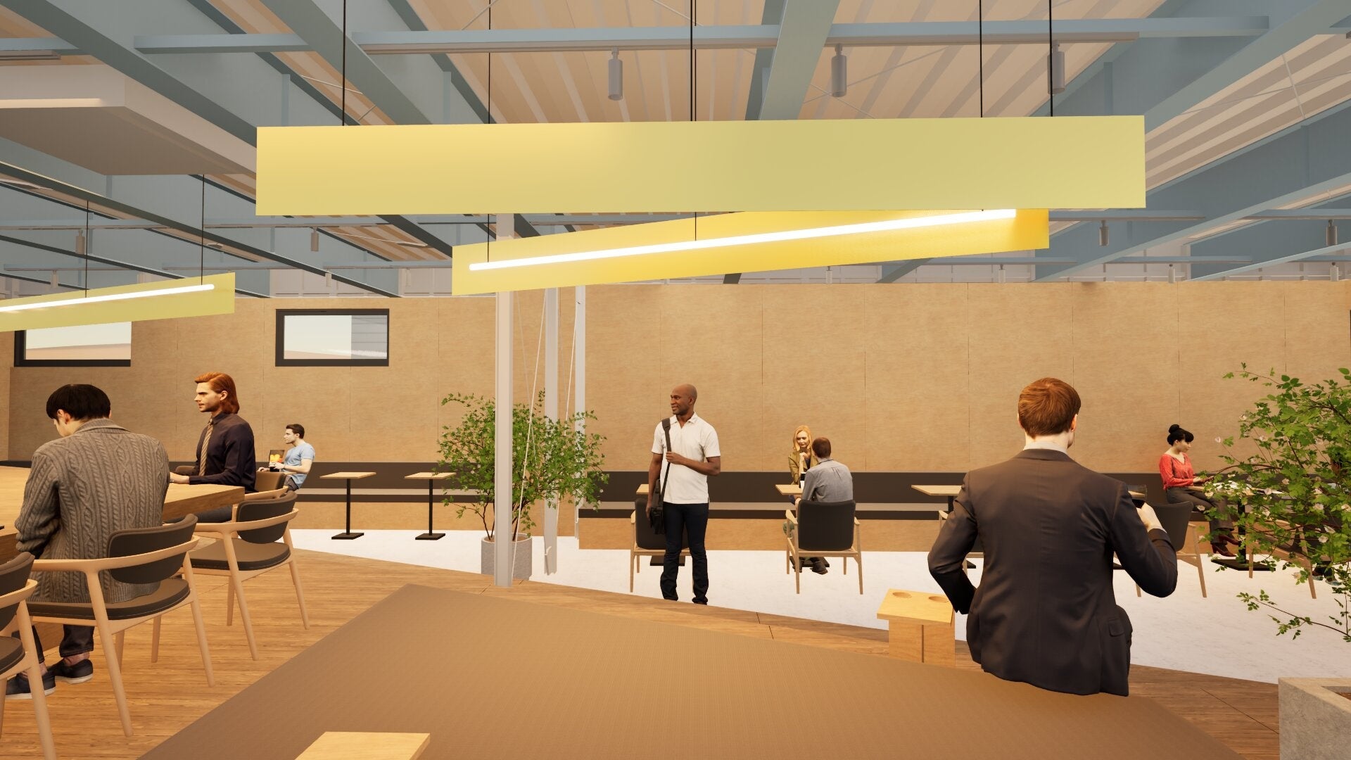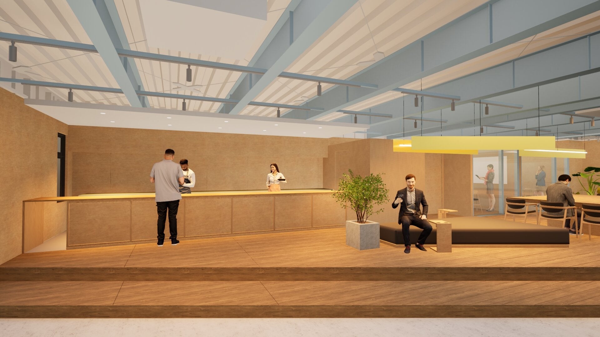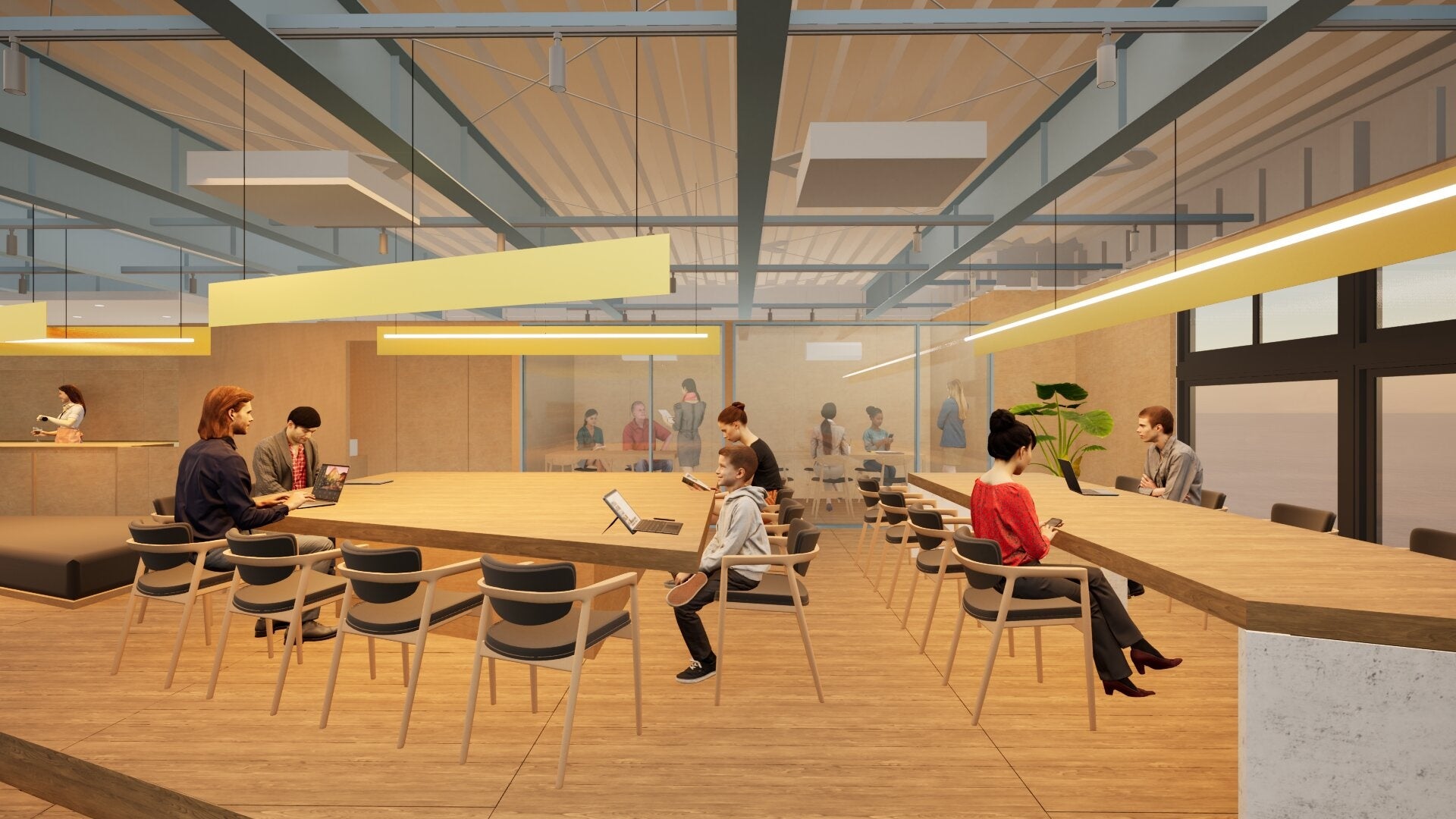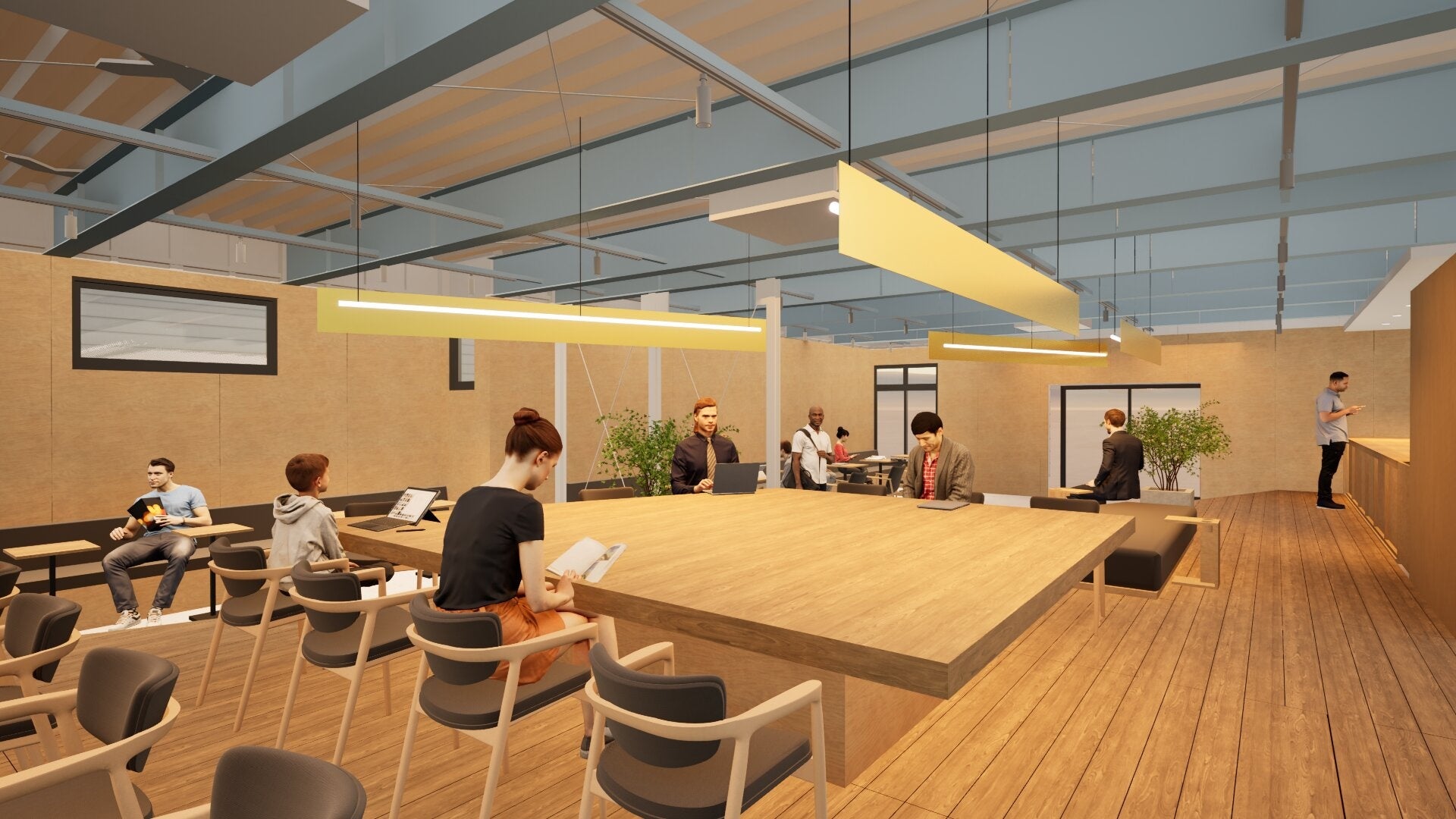 起業家、フリーランス、学生、企業人材が日常的に集うオープンワークスペース。JR銚子駅1番線ホームからも視認できるガラスファサードを備え、街と仕事がつながる開かれた環境を実現します。