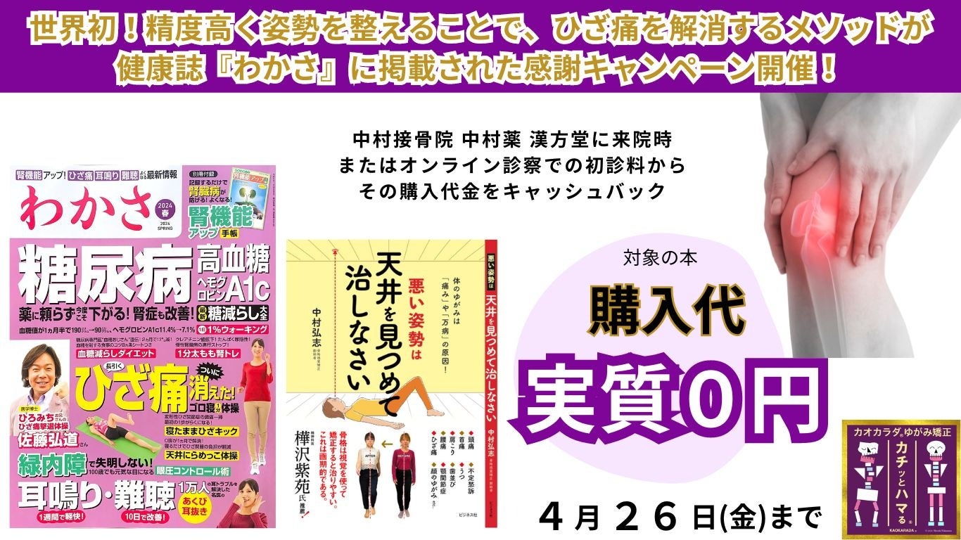 ・内容:健康誌『わかさ』2024年春号、または書籍『悪い姿勢は天井を見つめて治しなさい』どちらかを購入頂くと、中村接骨院 中村薬 漢方堂に来院時またはオンライン診察での初診料からその購入代金をキャッシュバックします。