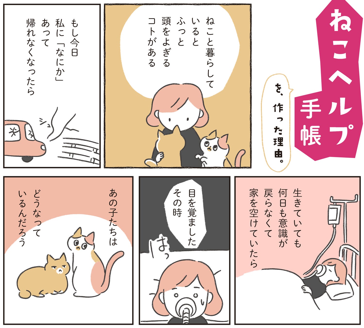 「ねこヘルプ手帳」は、急病や災害時に飼い主が意識を失い、家にいる猫の存在がわからずに猫を死なせてしまうという悲しい事故を防ぐためにできた手帳です。