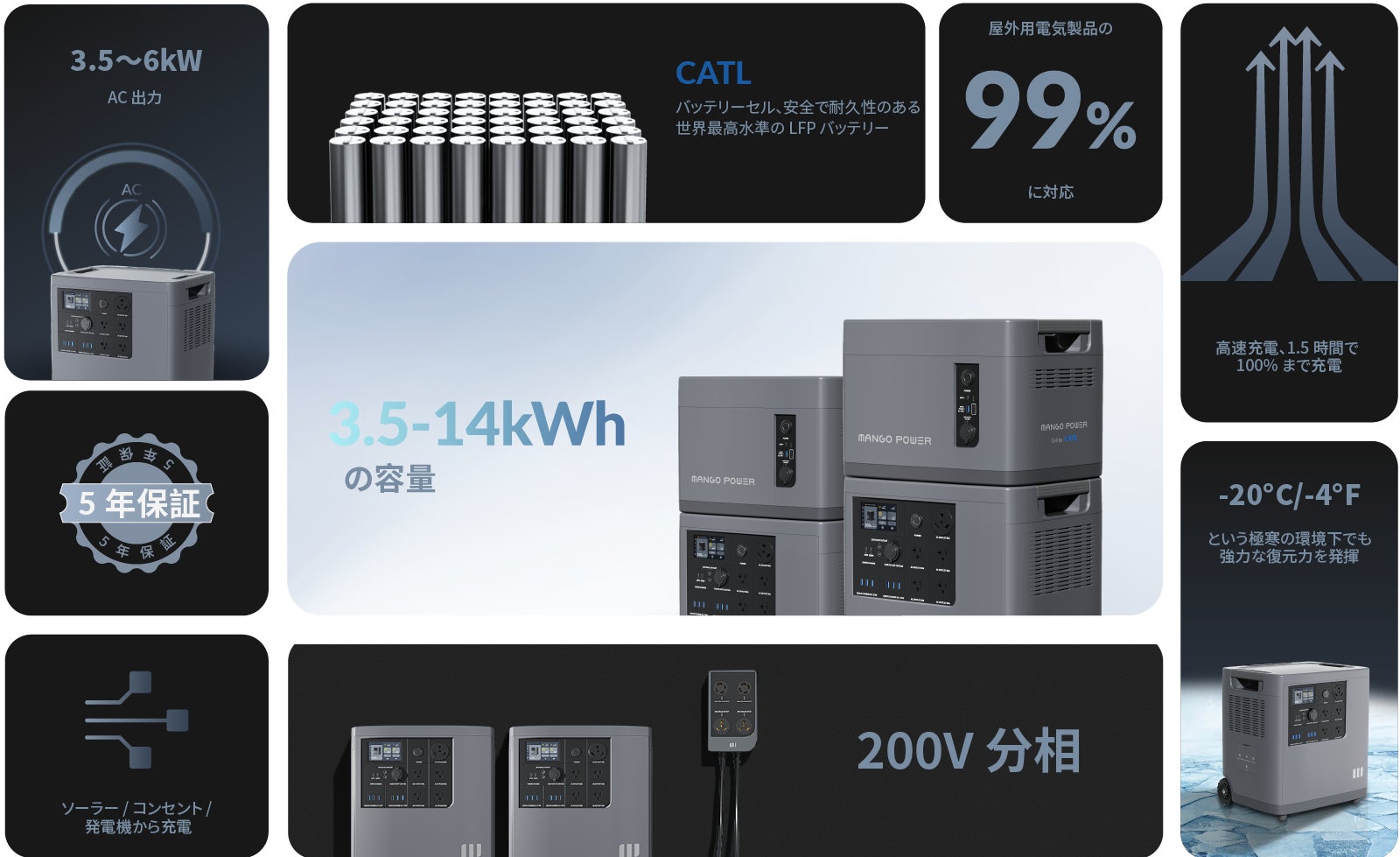 Mango Power Eは安全性と耐久性を誇る世界トップクラスの「CATL」社産LFP電池採用。大容量、高出力、急速充電等高性能を重ね備え、業務用電源としても家庭用蓄電池としても使える超大容量ウルトラ蓄電池です。