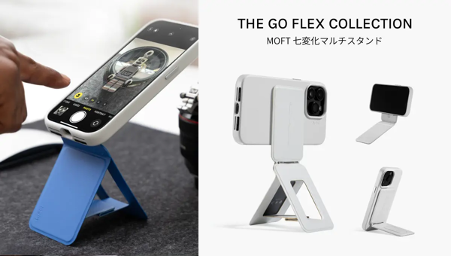 「MOFT 七変化マルチスタンド」は、いつでもどこでもすばやくセットアップできるスマホスタンドです。独自の設計でカードサイズから撮影スタンド、多角度スタンド、自撮りグリップの3つのモードに展開できます。