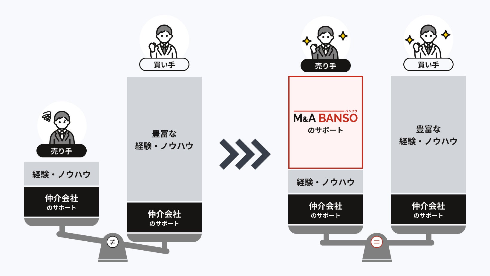 しかし、様々な売り手オーナー様の支援をする中で、仲介形式やM&Aプラットフォームの利用が望まれる場合があり、その場合でも、売り手と買い手の経験やノウハウの差を埋めるためのサービスを提供できないかを考え、生まれたのが「M&A BANSO」です。