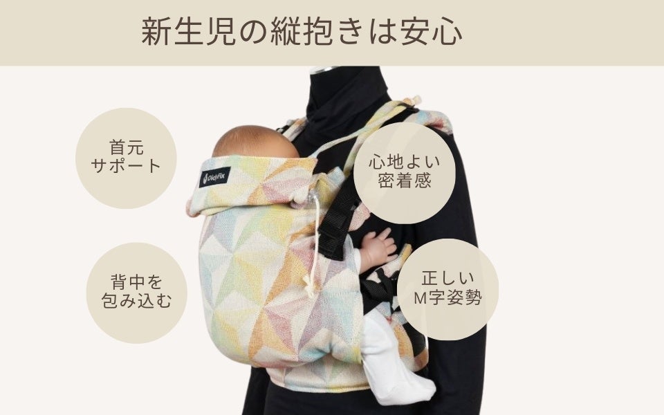 「ディディフィックス」(DidyFix)は柔らかい密着感でベビーラップのような心地良さを体感できる新コンセプトのバックル式抱っこ紐です。小柄なママにもフィットしやすい設計で、肩や腰への負担を軽減します。また、新生児から利用可能なオリジナル構造と上質な布素材は、赤ちゃんのM字姿勢と緩やかな背中のカーブをサポートし、0ヶ月から安心して縦抱きができます。さらに、4ヶ月からはおんぶが可能なので、成長に合わせて利用できます。