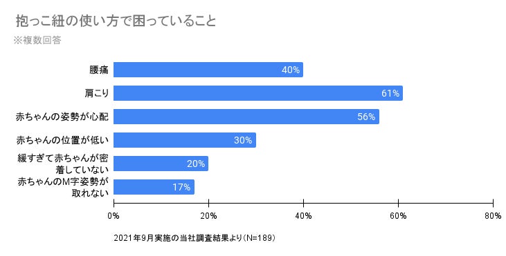 育児用品の中で特に使用頻度が高いバックル型抱っこ紐(腰ベルトタイプ)は、「肩こり」(61%)、「腰痛」(40%)、「赤ちゃんの位置が低い」(30%)などの体の痛みが抱っこを困難にする原因となり、多くのママがこれらのつらい経験をしています。大人の身体的な負担の他、「赤ちゃんの姿勢が心配」(56%)など赤ちゃんの発達に与える影響を心配するパパママも半数を超えています。