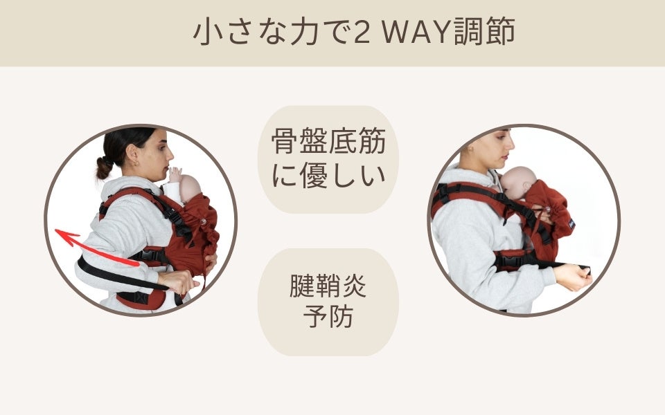 人間工学に基づいた2 way ベルトはディディモスのオリジナルなデザインで、小さな力でも簡単に調節できます。ベルトを腕にかけ、後方に引っ張ることで、産後のママの骨盤底筋への負担を軽減し、腱鞘炎の予防につながります。