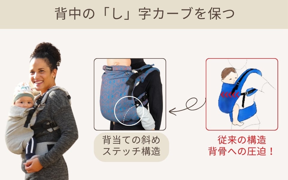 斜めに縫い込まれた背当てのステッチ構造により、赤ちゃんの背骨への圧迫を防ぎます。ショルダーベルトを引いて調整することで、赤ちゃんを骨盤からしっかりと支え、背中のカーブを優しく保ちます。