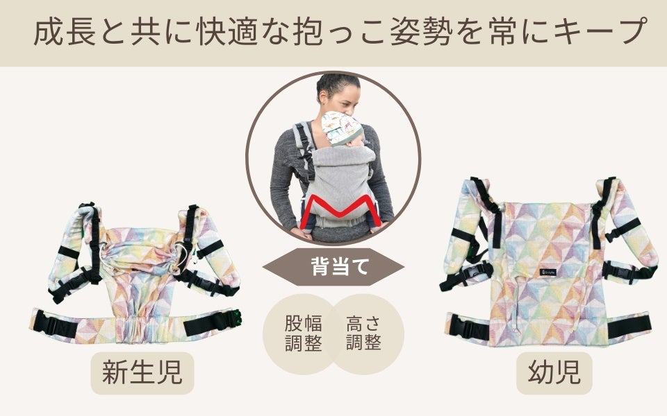背当ての幅と高さを無段階で調整可能で、成長と共に常に理想的な脚のM字と背中のカーブを保ちます。高い位置で抱っこやおんぶができるため、体重を上半身全体に分散し、赤ちゃんが重くなってきても大人への負担を軽減できます。