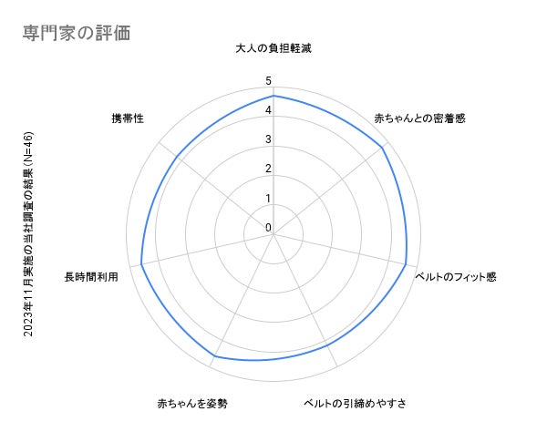 専門家は特に、「赤ちゃんの赤ちゃんの正しいM字の姿勢や背中のカーブを保つ工夫」、「ショルダーベルトの調整しやすさ」に着目し、これらの機能が大人と赤ちゃんに快適さをもたらしていると好意的な反応が得られました。