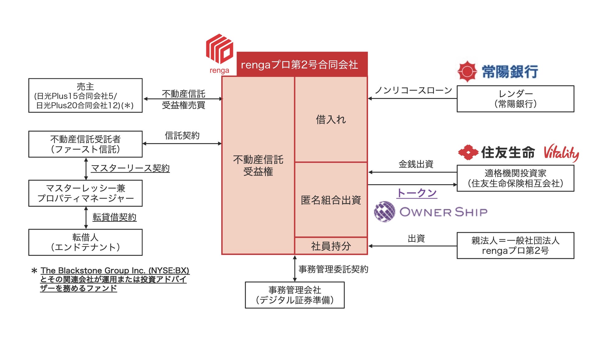本ファンド組成にあたっては、①The Blackstone Group Inc. (NYSE:BX)とその関連会社が運用または投資アドバイザーを務めるファンドが対象不動産の売り手となり、②DS社の株主である常陽銀行(※同行はCVC(コーポレートベンチャーキャピタル)ファンドであるJレイズ投資事業有限責任組合を通じてDS社に出資)がノンリコースローン(*5) に取り組み、③住友生命保険相互会社が適格機関投資家として全額出資しました。