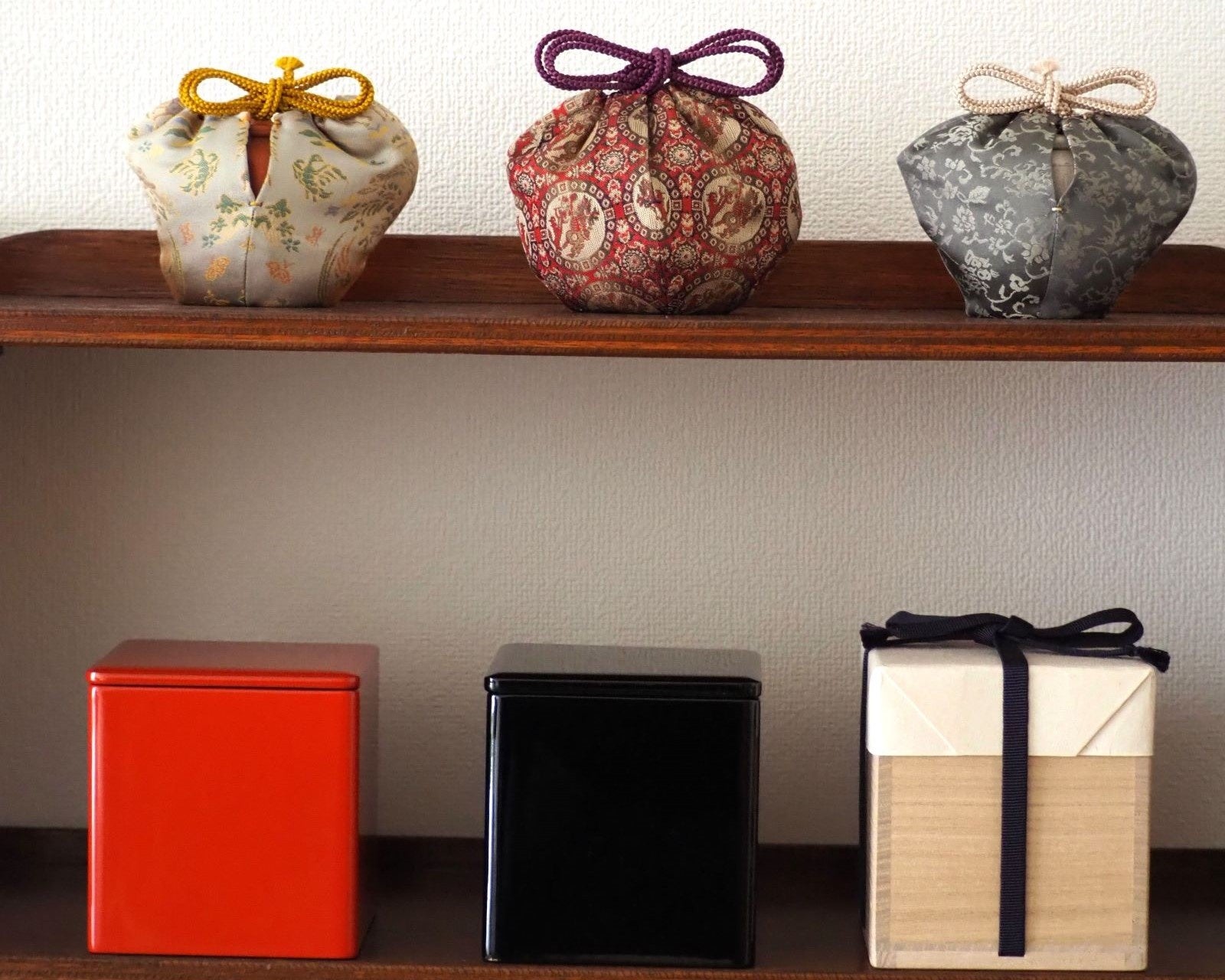 お茶を飲む気分を上げる華やかな仕覆、漆塗箱