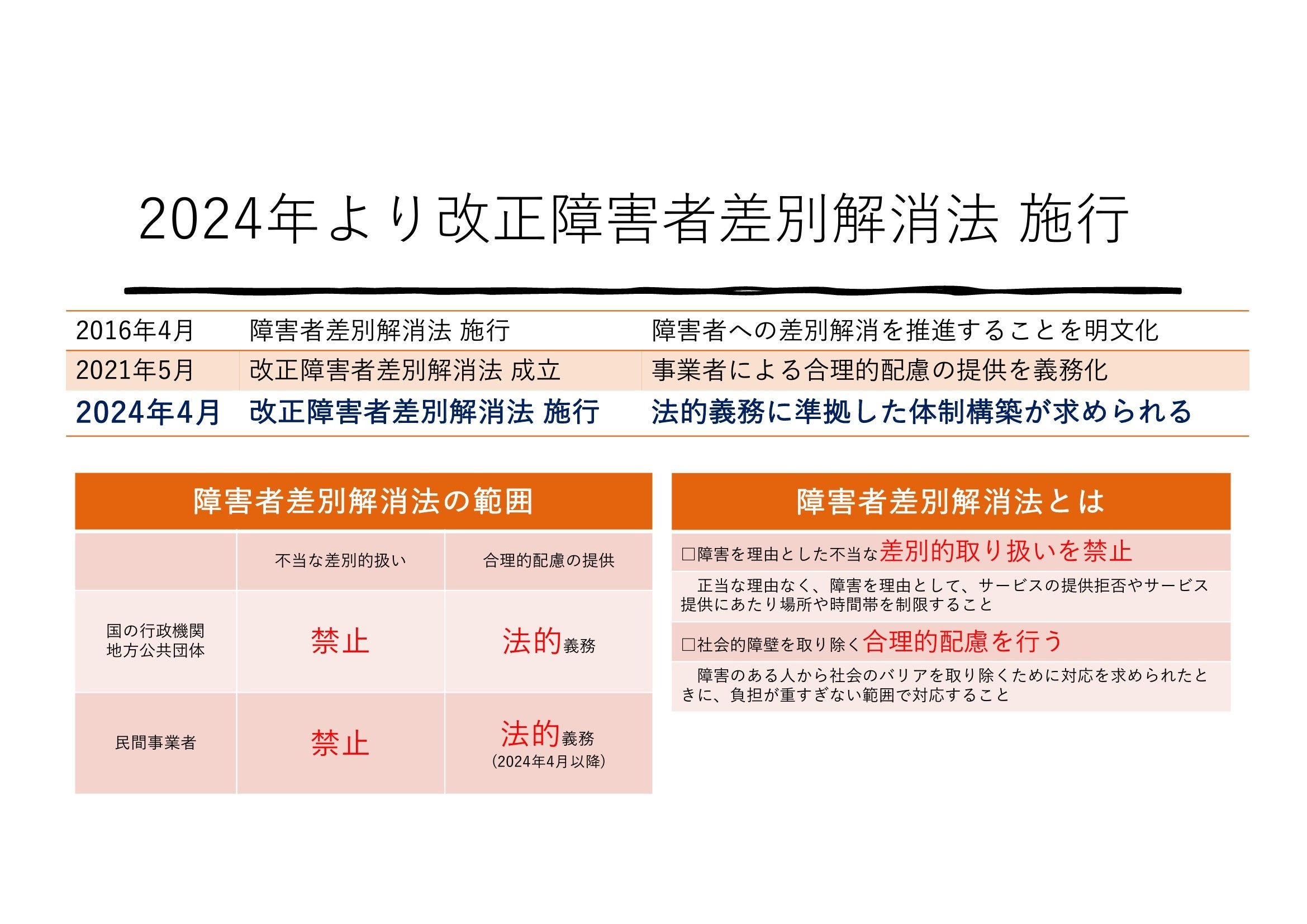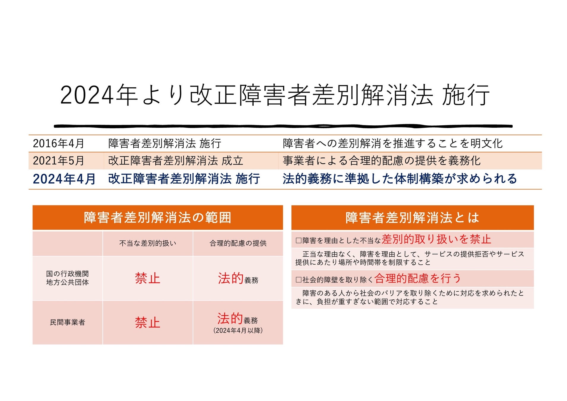 2024年4月より、改正障害者差別解消法が施行されます。改正のポイントは、民間企業の障がい者雇用はもとより、飲食店や小売店においても障がいのある人に対する合理的配慮の提供が義務付けられることです。