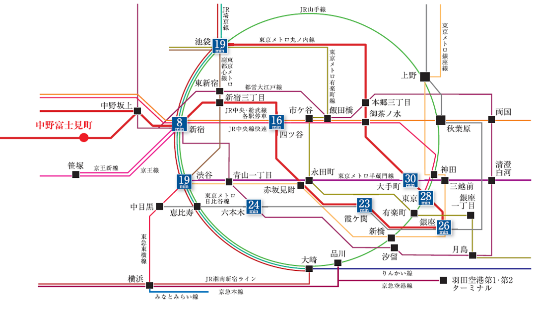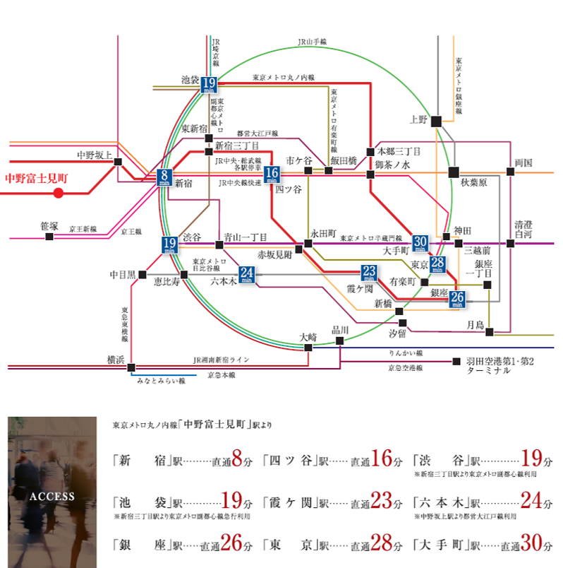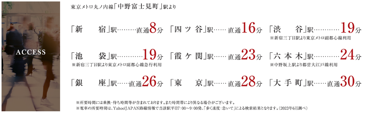 東京メトロ丸ノ内線で新宿駅より直通8分、西方約3kmに位置する住宅都市、中野富士見町。