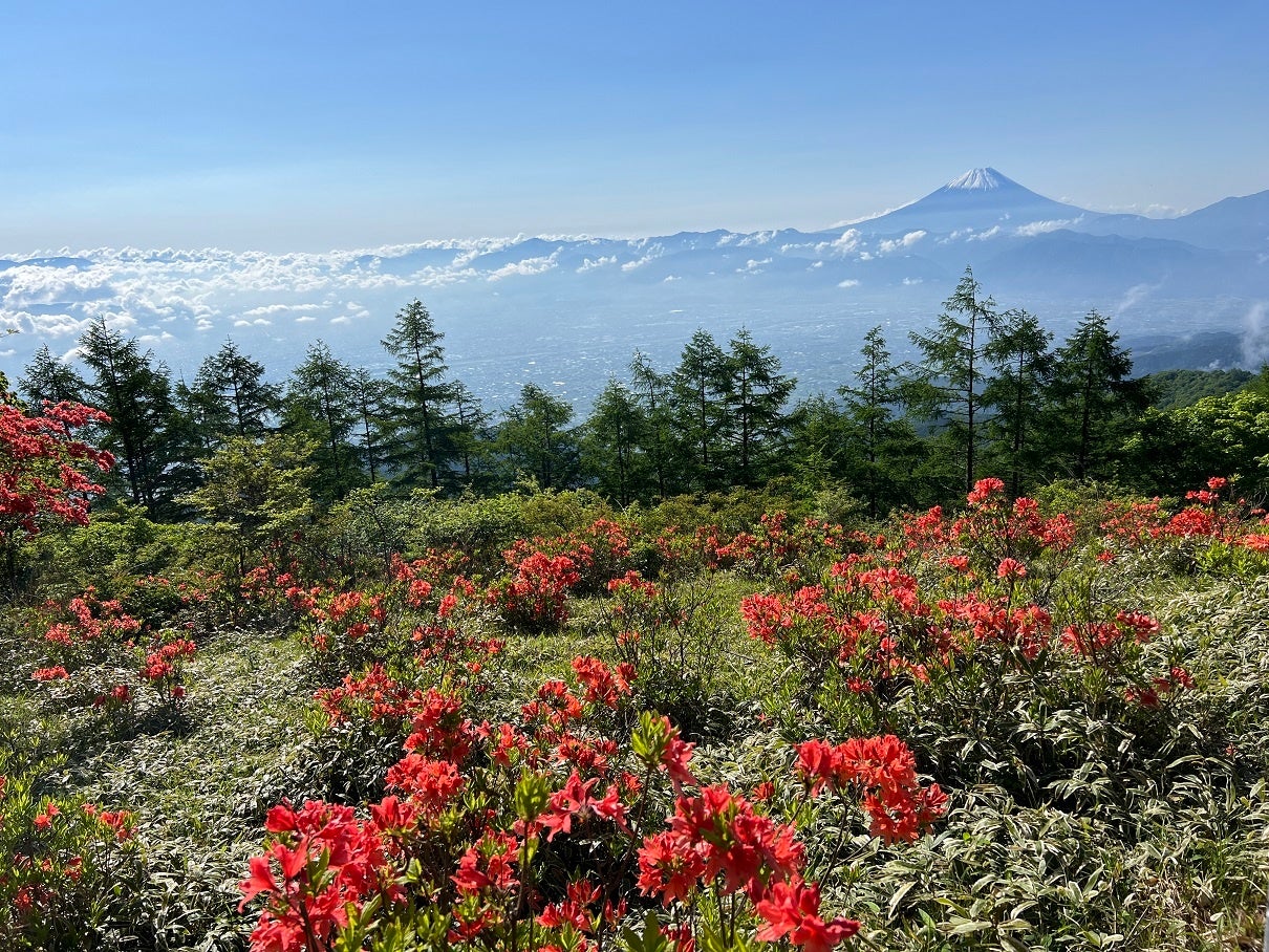 6月、南アルプスの前衛峰・1731mの甘利山(あまりやま・山梨県/韮崎市)に、今年も1年でもっともにぎわう季節がやってきた。標高1600mの最寄駐車場から徒歩10分で広がる、富士と甲府盆地、そして鮮やかな朱色が見事なレンゲツツジの群落。この時期一度は見ておきたい絶景だ。