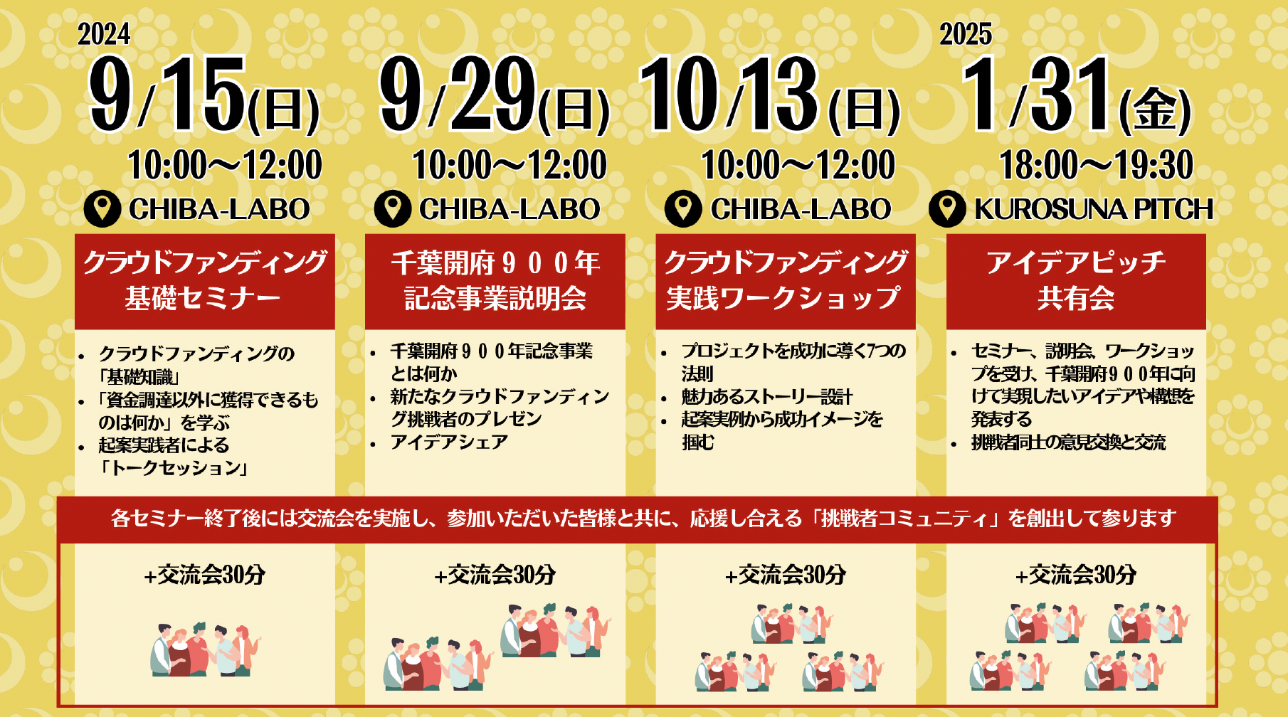 2026年、千葉開府900年となることを受け記念事業をクラウドファンディングを活用して、実現していくために4回のセミナー、説明会、ワークショップなどを開催することが決定し、参加者の募集を開始いたします。 セミナーには千葉開府900年に向け、今年クラウドファンディングを実践した人、また今年10月にクラウドファンディングを起案する挑戦者も登壇いたします。 セミナー事業を通して、これからの千葉の未来を作る “挑戦者” たちがクラウドファンディングを活用してアイデアが実現できるようサポートしていきます。