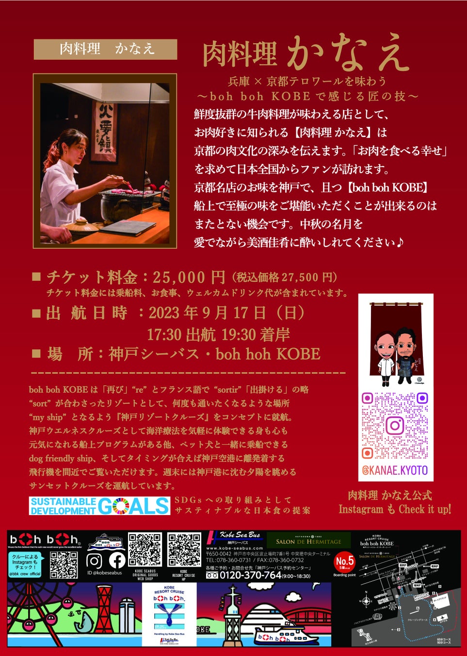神戸シーバスboh boh KOBEでは、兵庫×京都テロワールを味わう、一夜限りの特別イベント『boh boh KOBE×肉料理かなえ~船上で感じる匠の技~』を開催します。