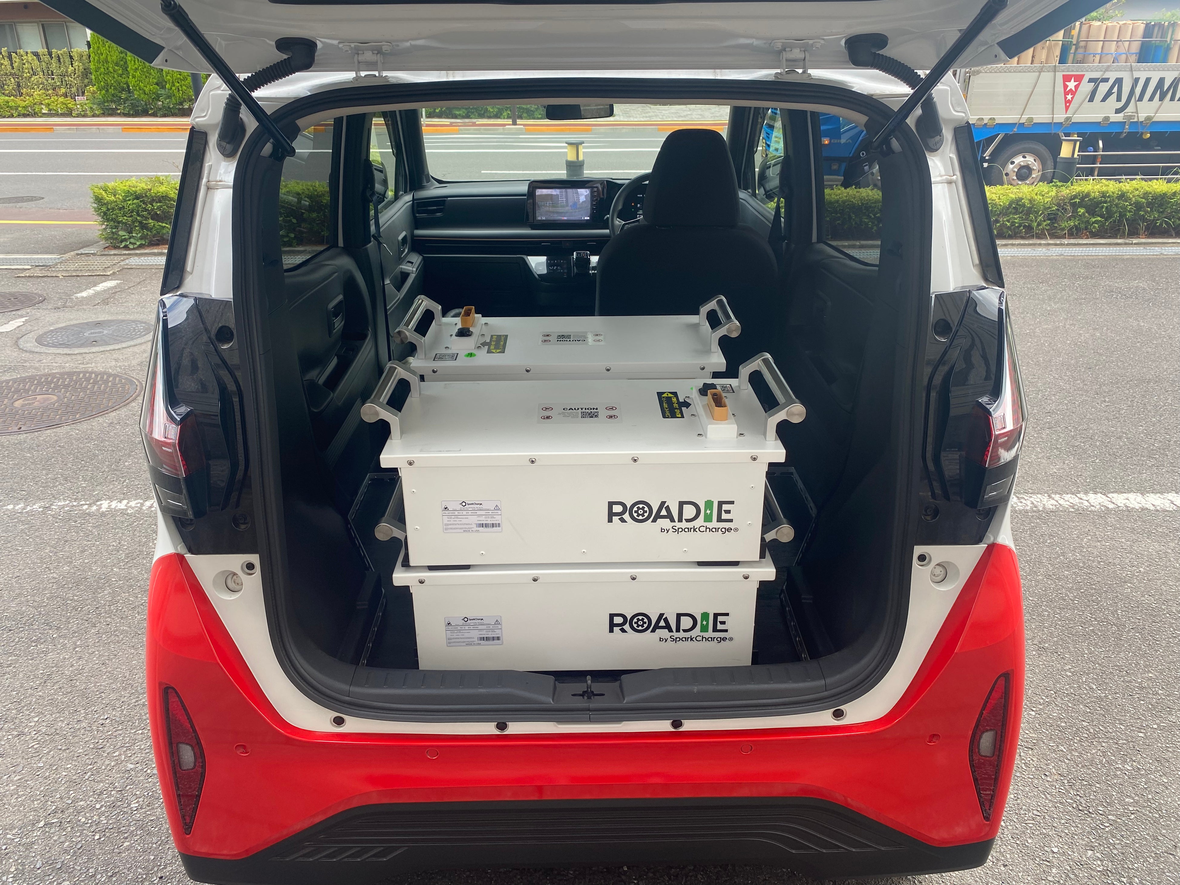 同時に、固定式充電器(急速充電・普通充電)の設置も急務となり各社設置を進めておりますが、弊社では、米国SparkCharge社と共同で、「どこでも急速充電」をコンセプトに、外部入力設備不要、完全スタンドアローン設計のEV急速充電器「Roadie V2」の普及に取り組んでおります。