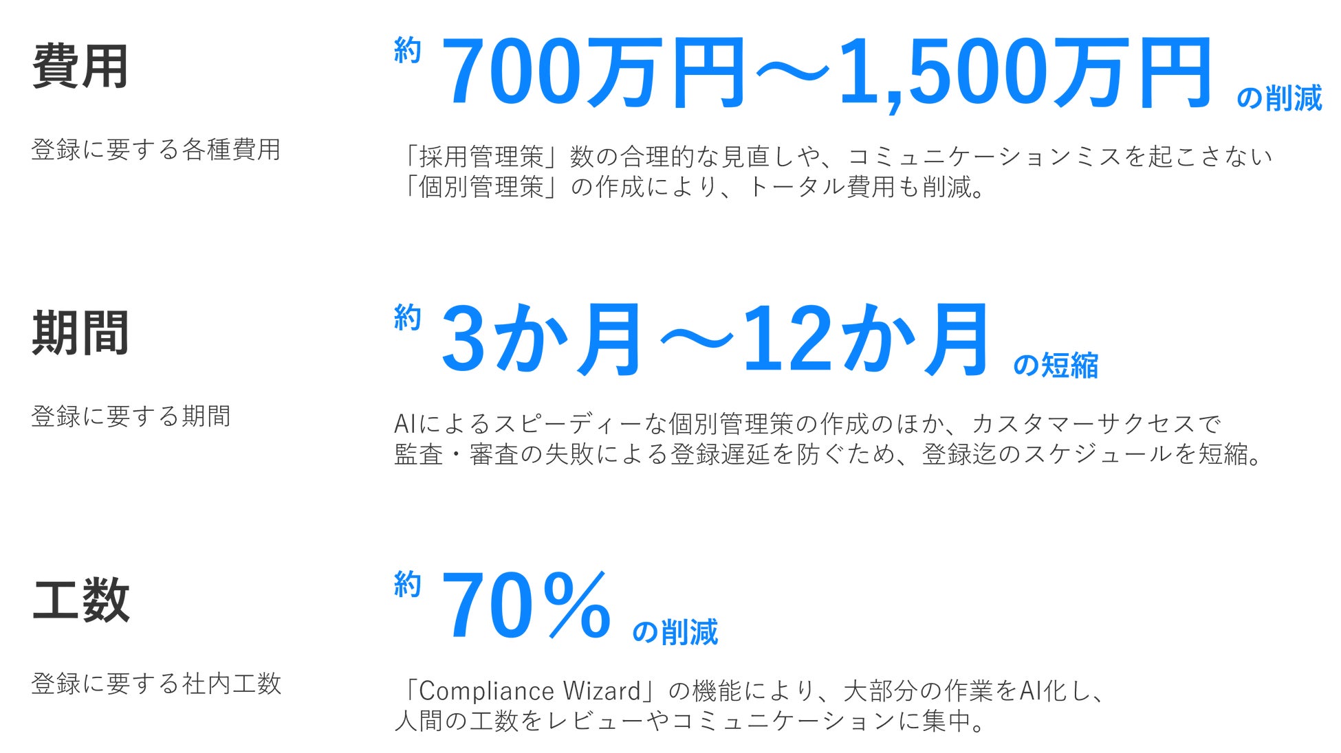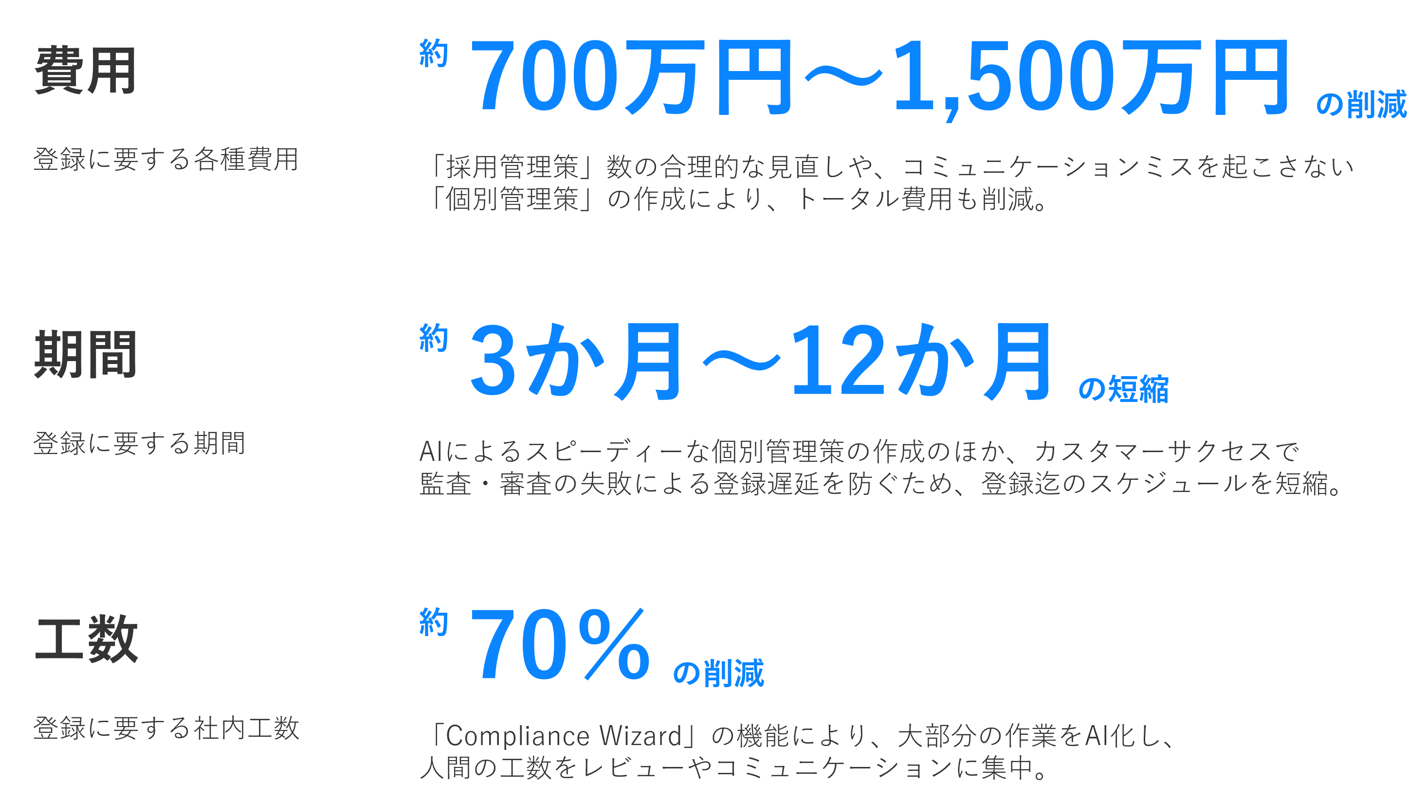 ISMAP 侍は、AIプロダクト「Compliance Wizard」によるプロフェッショナル業務の自律化と、ISMAPに係る唯一無二の専門集団によるコンサルティング型のカスタマーサクセスによって、期間・費用・工数の削減を実現しています。