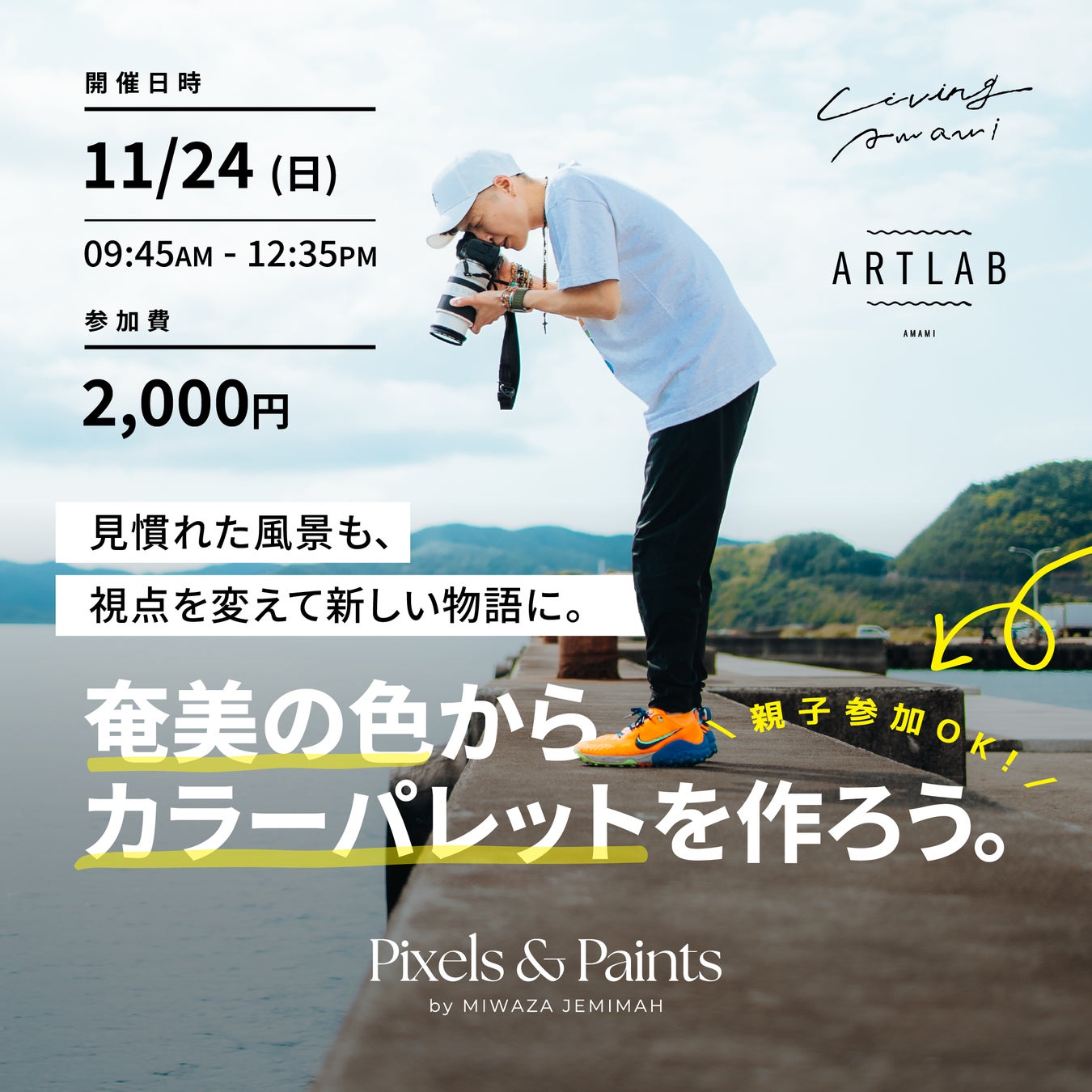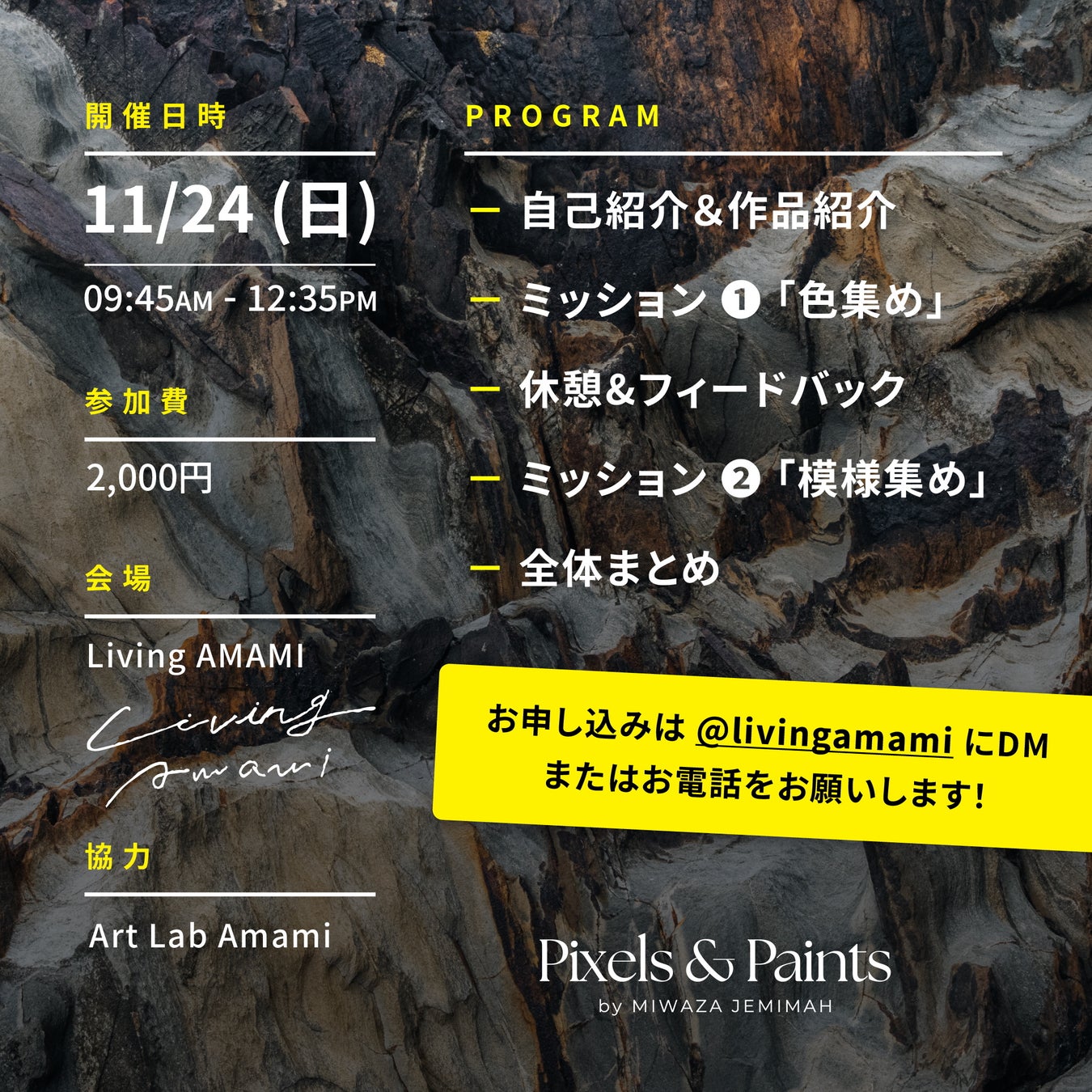 合同会社KAZAMIが運営する「ライフ&ワークスペース Living AMAMI」は、2024年11月23日(土)~12月8日(日)まで開催されるアートイベント「ash Design & Craft Fair」に初参加。フォトグラファー、ビデオグラファーとして活躍するMiwaza Jemimahが今回のために奄美大島で制作した作品シリーズ「Pixels & Paints」の展示販売を行います。