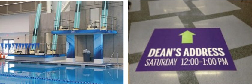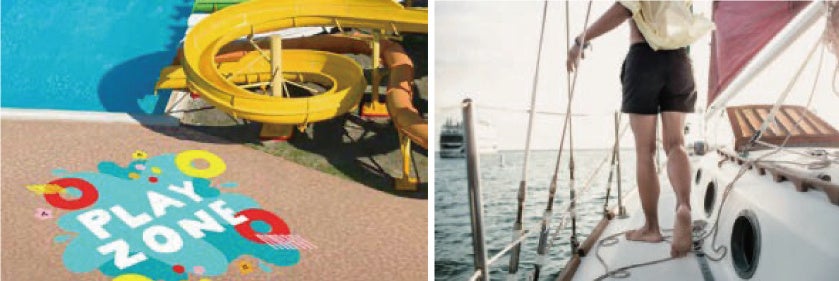 耐油・薬品性が高く、 ガソリンや各種オイルなどの石油類、塩水や塩素(漂白剤)などの化学薬品に晒される環境での使用が可能です。塩ビ素材のため、靴での歩行に加え、素足での歩行も可能なため、プールサイドや浴室などでの広告、プロモーショ ンやフロア誘導サインに使用できます。タイルなどの陶材、大理石などの石材、コンクリート、リノリウムなど様々 な床材にプライマー不要で施工可能です。