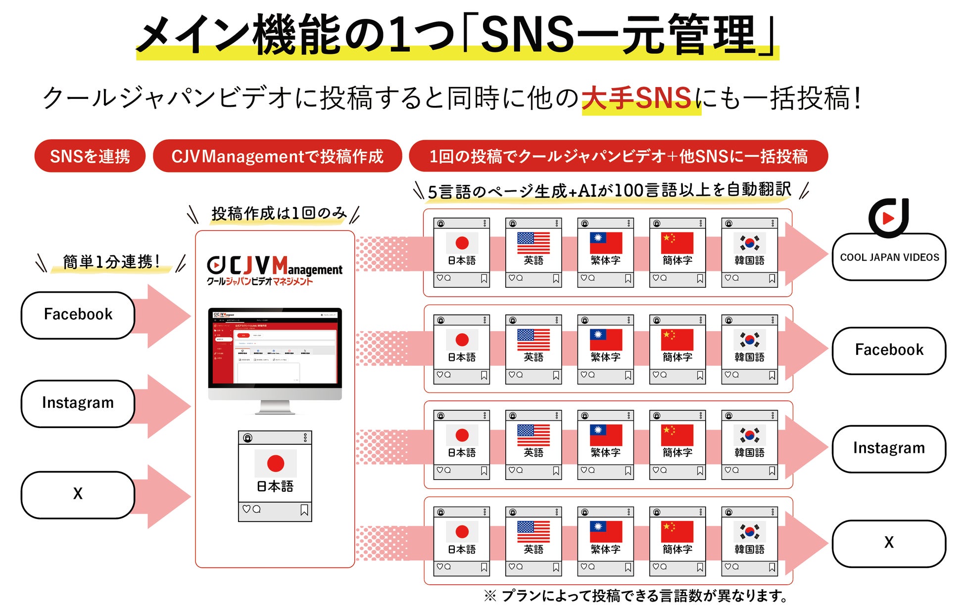 「クールジャパンビデオ」内のSNS投稿はもちろん、主要の大手SNSプラットフォーム(今回のリリースではFacebook、Instagram、X)への一括同時投稿が可能です。