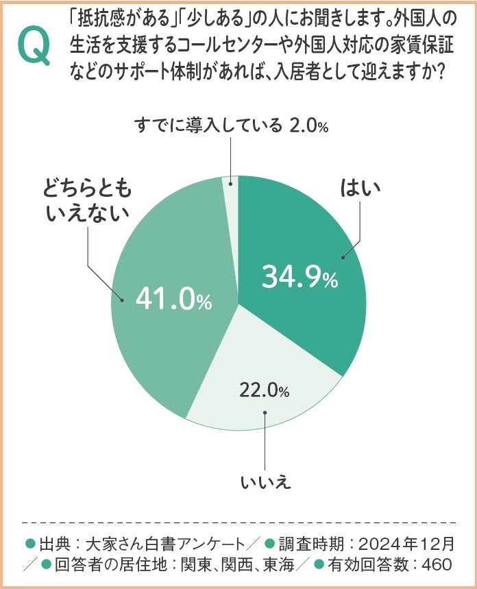 外国人の受け入れに「抵抗感がある」または「少しある」と回答した大家さんに対し、外国人の生活を支援するコールセンターや外国人対応の家賃保証などのサポート体制があれば受け入れを検討するかを尋ねたところ、34.9%の大家さんが「はい」と回答しています。