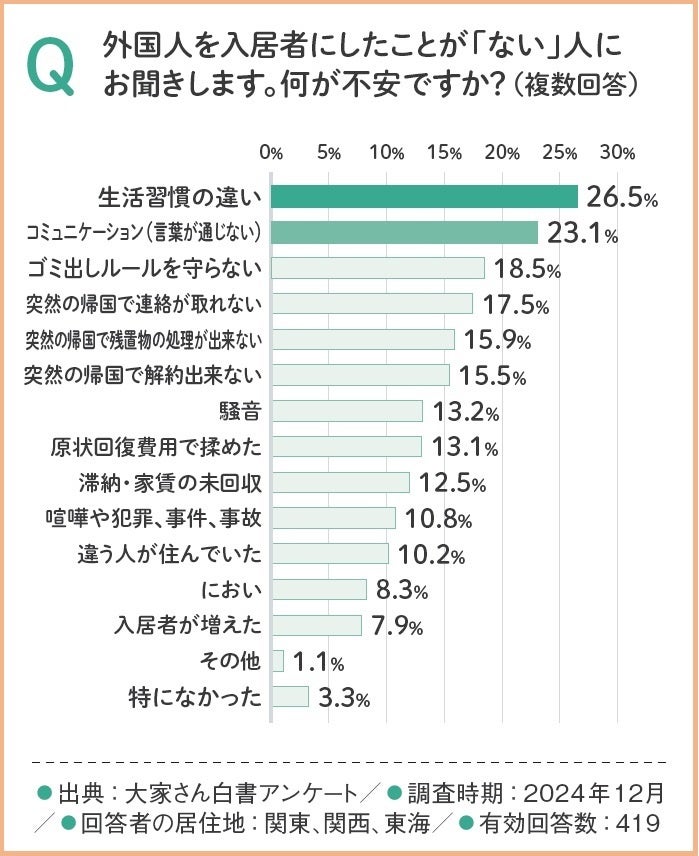 特に「生活習慣の違い」(26.5%)や「コミュニケーション(言葉が通じない)」(23.1%)といった文化・言語の壁に対する不安が大きく、日常生活上のトラブルを懸念する声が多く見られました。