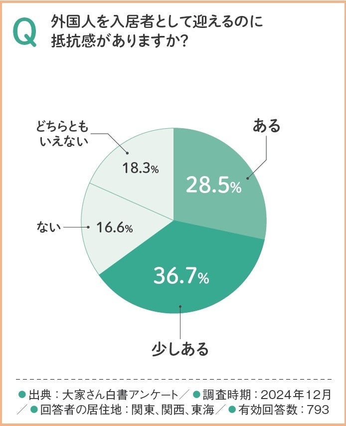 一方で、外国人入居に「抵抗感がある」「少しある」と回答した大家さんは65%に達し、依然として心理的なハードルが存在しています。